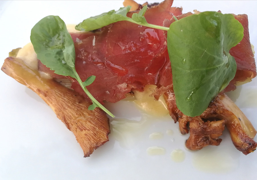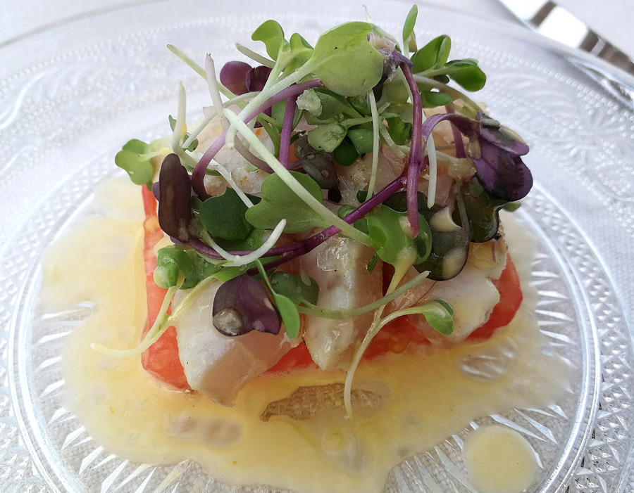 Different menus are offered for lunch and dinner. At lunchtime, the menu is à la carte. We chose to share the starter of grilled avocado with salad, an apricot vinaigrette, and strawberries from Sa Pobla (16€). Before this arrived, our server brought us a warm, split llonguet roll, with smoked butter and a slice of sobrasada and botifarró as a complimentary appetizer.