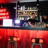 A neon sign on the wall as you enter Kasui sums up the ethos: ‘Eat it, drink it, share it.’ The restaurant’s décor has something of a red vibe, which gives it a womb-like cosiness. Single tables line one wall, which faces the bar and open-kitchen counter, behind which Paco and Miki and his fellow chef Álvaro Busquets work their magic. Miki is master of the ‘robata’ – the Japanese-style charcoal grill – and Paco mixes the excellent cocktails.