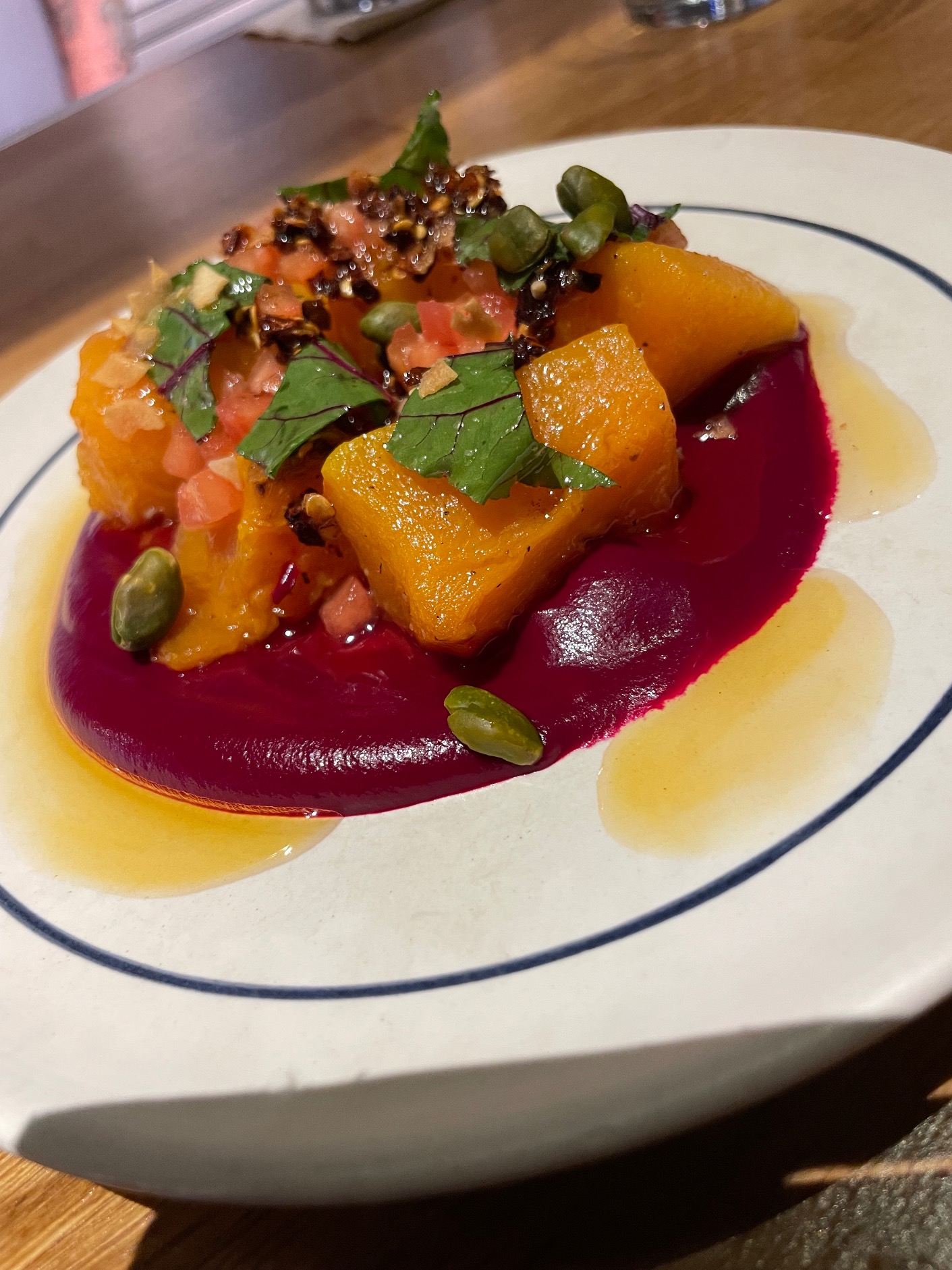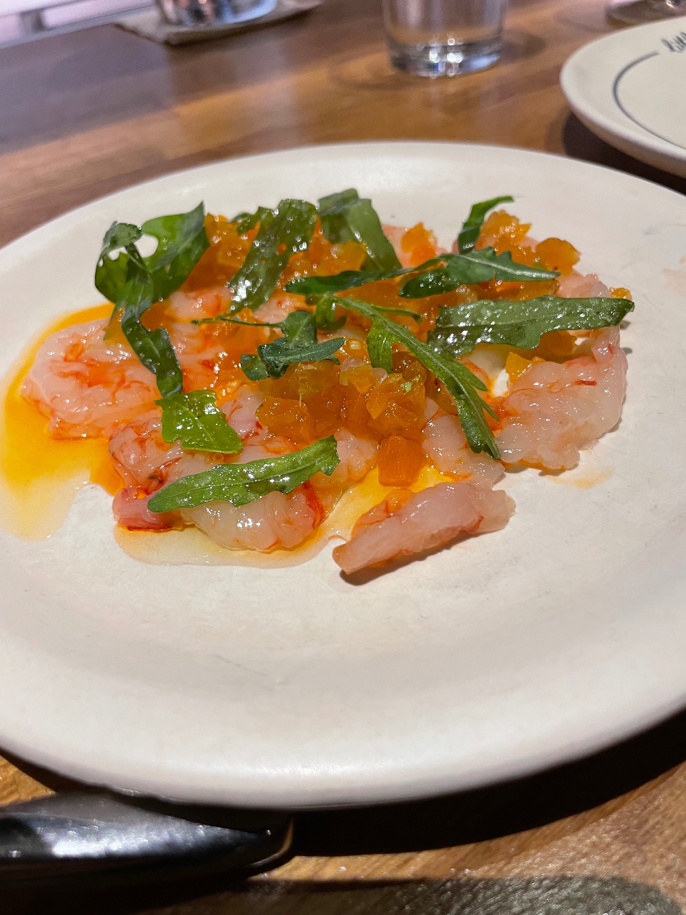 We shared pumpkin on a smooth beetroot purée with crispy chili (15€), and marinated red prawns with dried apricots and rocket (25€) – the combination of prawns with apricots was new to me, but it worked. Scallops on a menu always tempt me, and the freshness of Little Jarana’s combination of scallops with citrus and herbs (22€) made me wish I wasn’t sharing the plate.