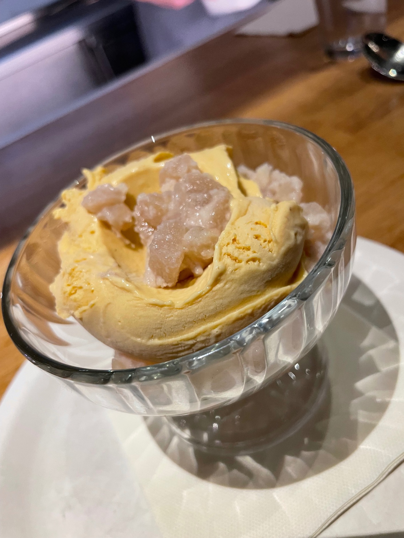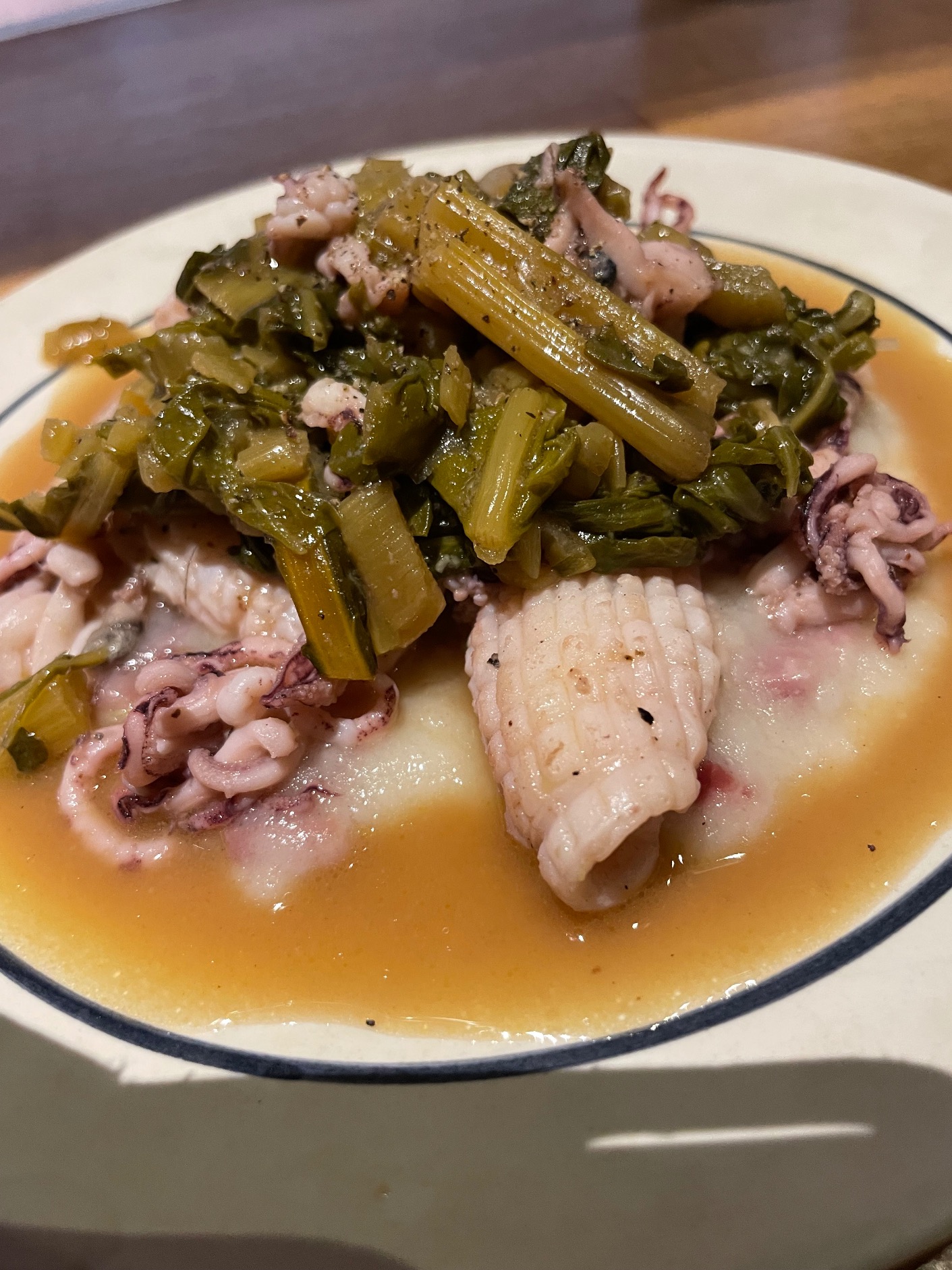 Perfectly soft squid with chard and ham (20€) followed, then artichokes on home-made mascarpone with cecina and pine nuts (18€). We ended this succession of moreish food with a silky, sabayon ice cream and poached pears (7€).