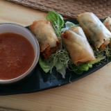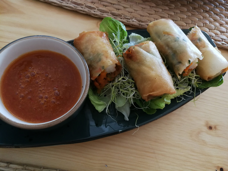If you’re not such a fan of beef, there are other main-course choices – including risotto, pastas, and a couple of fish dishes. From the tempting starters, we shared an excellent beef carpaccio (19,50 €) and crispy, home-made shrimp rolls with a sweet-chili sauce (14,25 €). Both dishes were delicious.