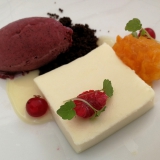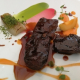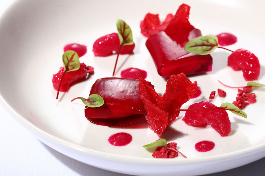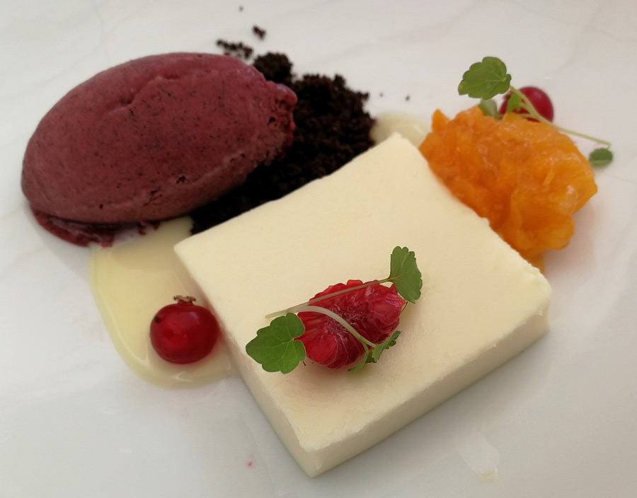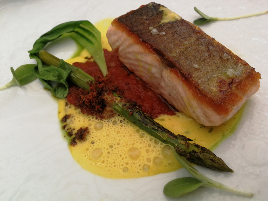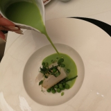 Marc’s silky gazpachos have always impressed me, and, after the snacks, our server poured plum gazpacho over marinated mackerel and broad beans – a delicious start. ‘Bombeta’ rice from Sa Pobla, in north Mallorca, came with smoked eel, lovage chlorophyll, and fresh cherries. The fish course was stuffed Dover sole fillet with pea purée, bergamot gel, and verjus beurre blanc. The delicious, toasted cauliflower served with the tender, slow-cooked guinea fowl and Pedro Ximenez jus was a talking point at our table. Our ‘award’ for the prettiest dish went to the dessert: a passionfruit honeycomb with pineapple and anis sorbet and mango spheres. Macarons and two types of chocolates were our favourites from the petits fours.