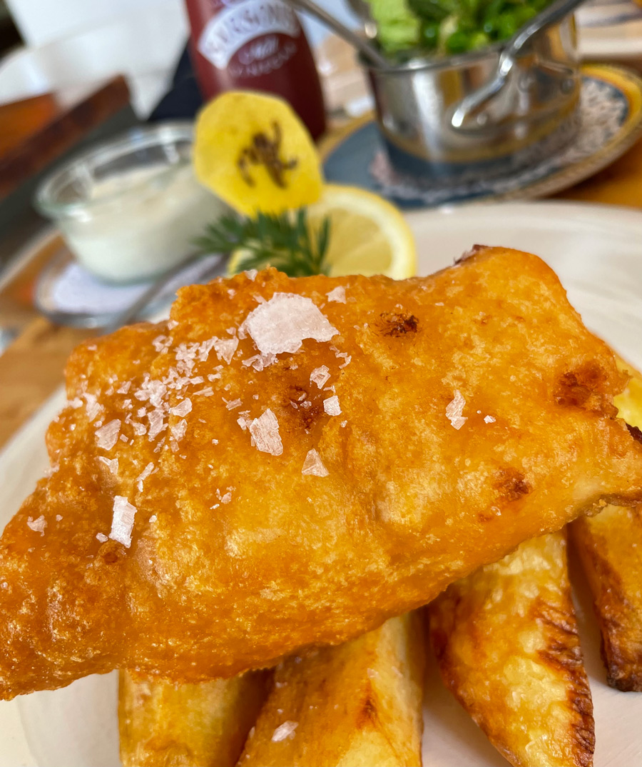The menu is short and changes slightly each week. Regular dishes include the MK fish ‘n’ chips (cod in a light, crispy batter made from ‘Rosa Blanca’ beer) with French-style minted peas and lettuce, and the London Calling salt-beef bagel. I had the best pork chop (rare breed Galician Celtic) at Market Kitchen that I’d ever eaten.