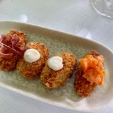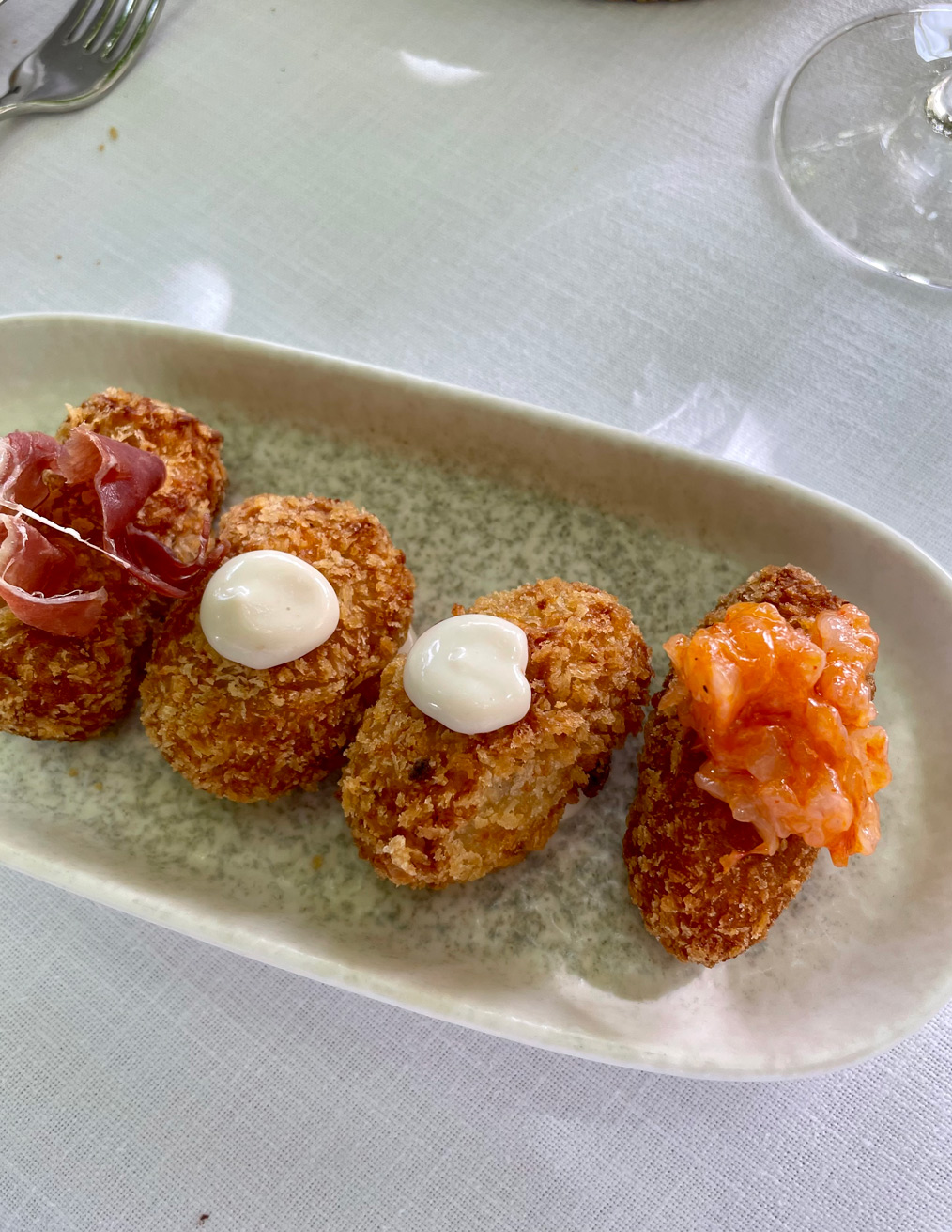 We had a choice of two starters, three mains, and two desserts. The starters were a cherry tomato salad with burrata cheese, fennel, rocket, and almond pesto – which my companion declared delicious. Having enjoyed croquettes here before, I chose the selection of four: ham, chicken, cauliflower, and red prawn from Sóller.