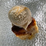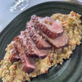 The main course is a ‘llauna’ dish: rice cooked traditionally on a tin baking tray. The menu offers three choices, of which one is shared at the table. The maître, Lucas Balbuena, brought the steaming tray to a side table from which he served the rice onto plates. We chose the duck breast rice with ‘arroz brut’ spices; the rice and the sliced duck were perfectly cooked, and the quantity was just right.