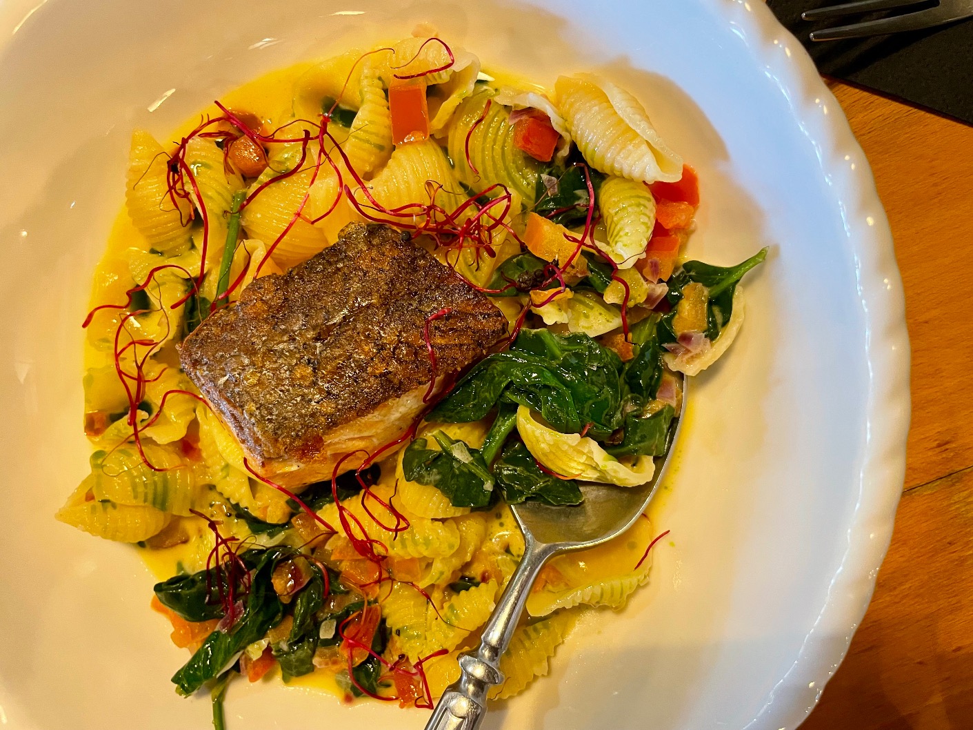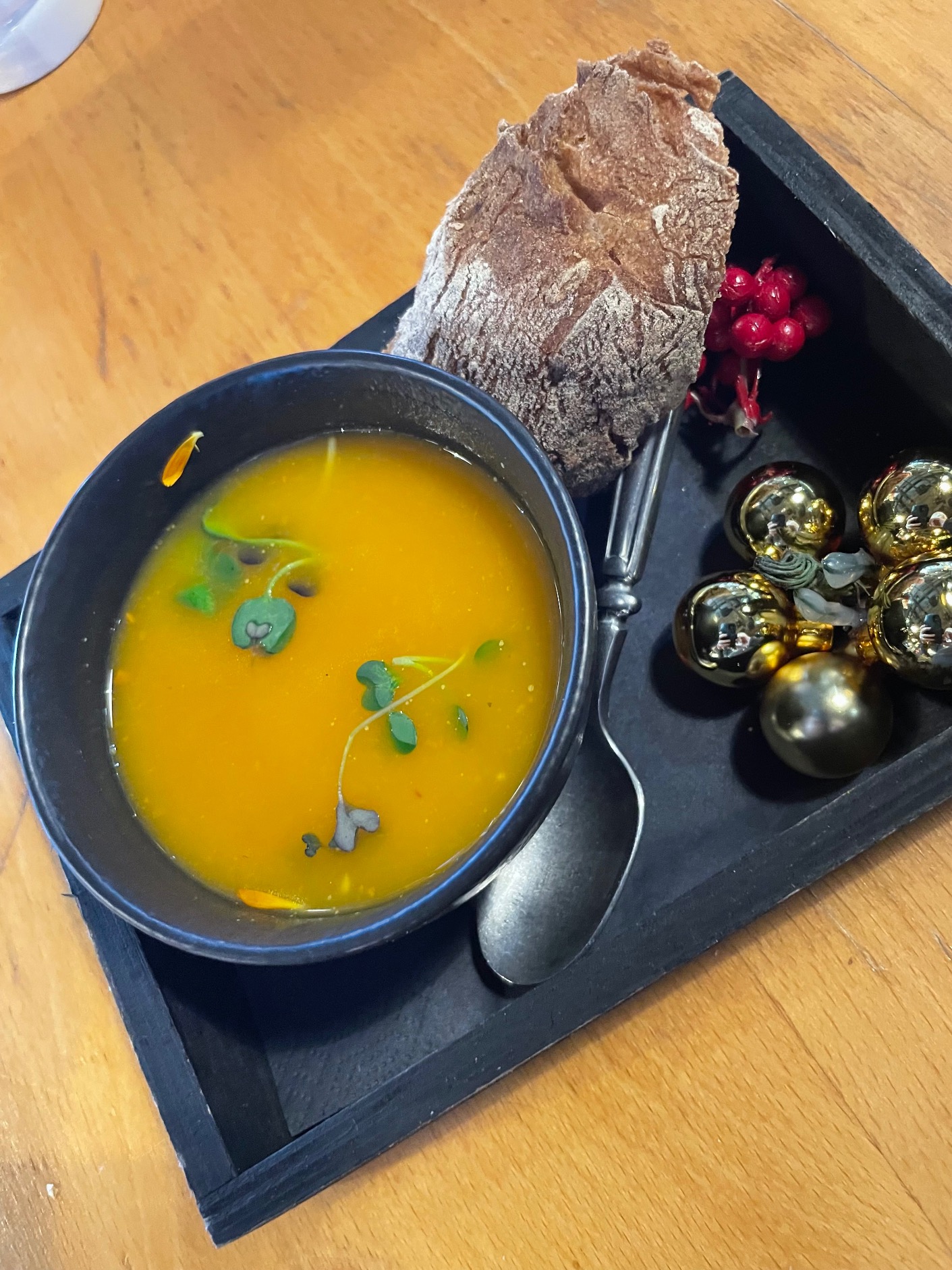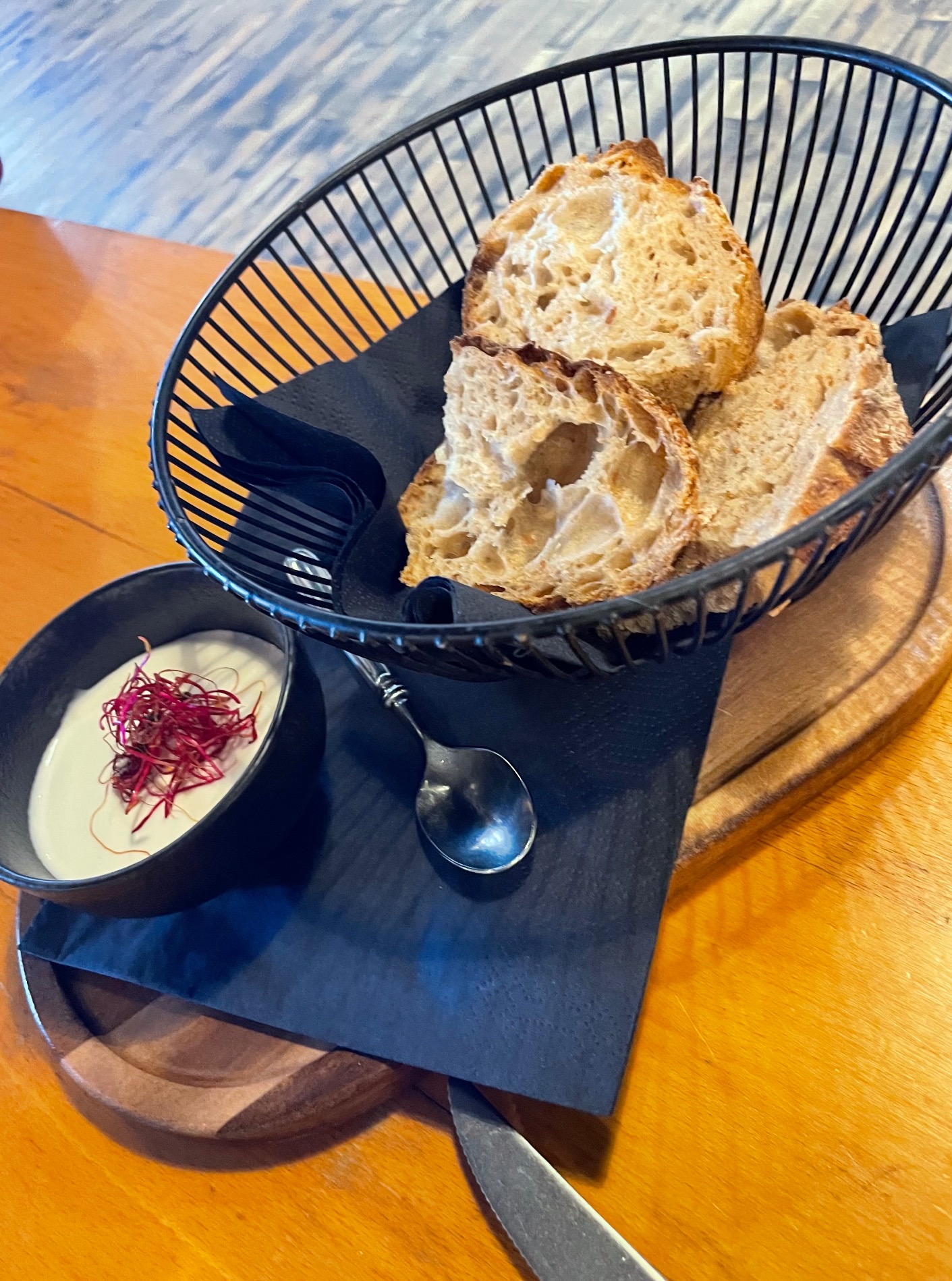 A basket of good, sourdough bread and aioli arrived without ordering (and appeared to be free of charge, as when I checked our bill later that evening, I noticed it wasn’t included). We also had a complimentary small bowl of tasty butternut squash soup.