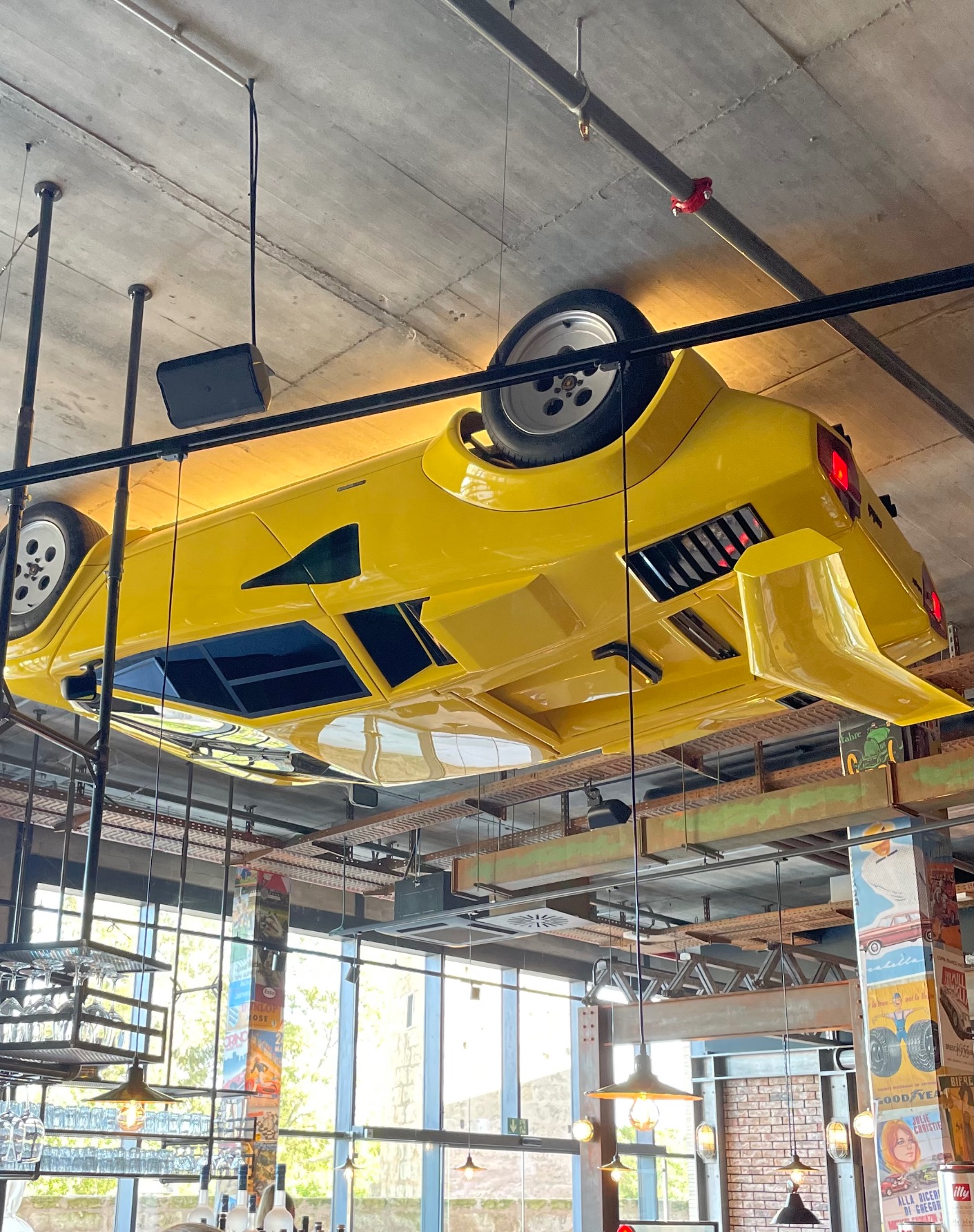 Indoors, there’s a large central bar with high chairs for drinks, with a sporty, yellow car suspended upside down above it, and an open kitchen at one end of the restaurant.