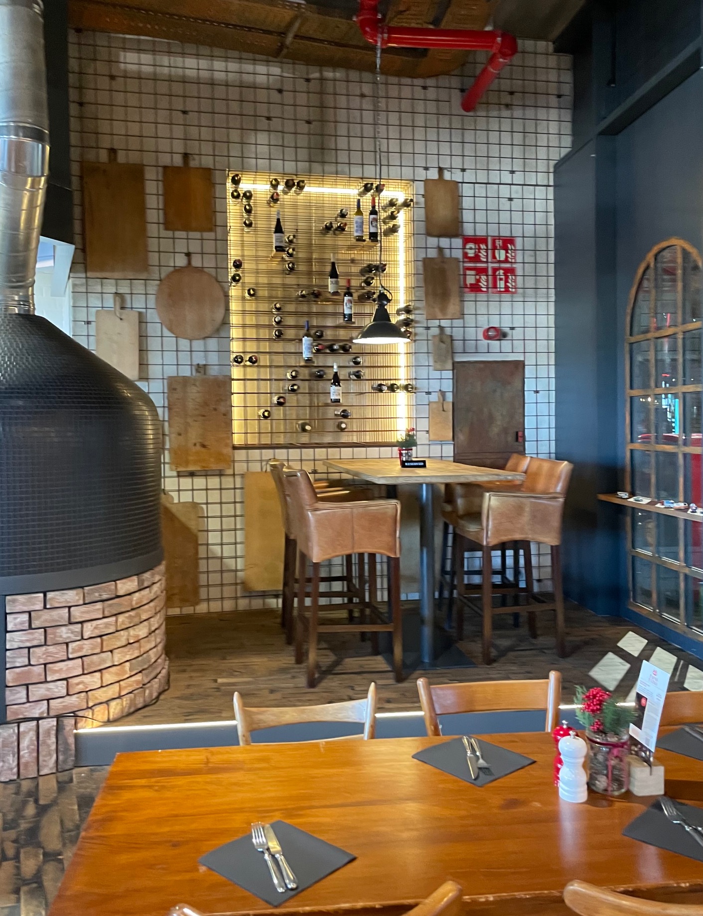 A separate area houses the pizza oven. The theming tastefully recreates the setting of a motor workshop, with some original automotive lworkshop memorabilia. The serving staff wear denim dungarees, but thankfully don’t have engine oil on their hands!