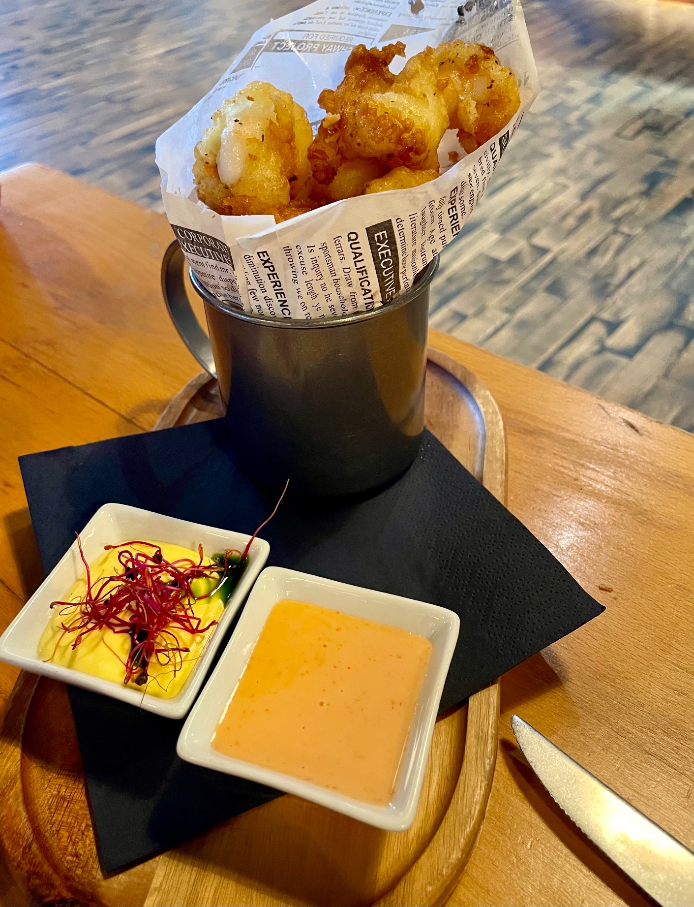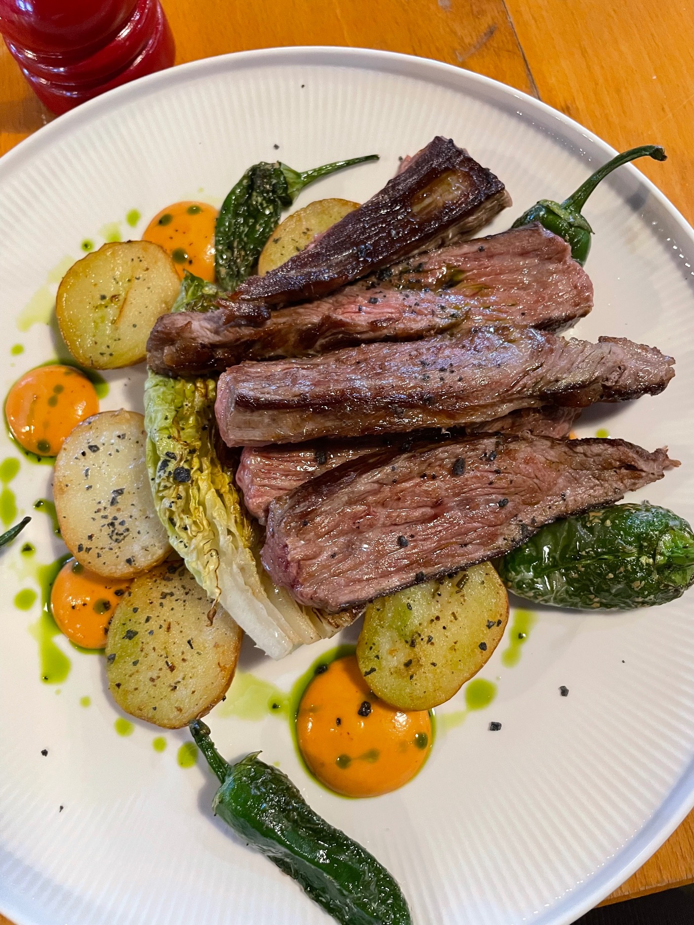 We ordered prawns in batter with saffron aioli and spicy mayo to share (11,95€), followed by pasta shells with salmon, spinach, and velouté (16,95€) for my companion, and a flavourful flank steak with grilled Romaine lettuce, baby potatoes, and Padrón peppers for me (22,95€).