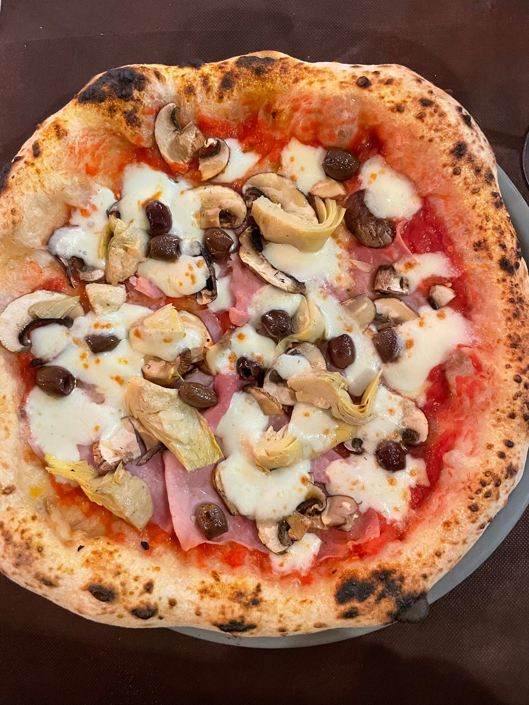 On our visit, there were 12 classic and nine pizzas on the menu, with prices ranging from 9€ to 18€. Both tomato and white-based pizzas are available. We chose a classic prosciutto e funghi (13€) and the gourmet prosciutto di Parma (18€). Both pizzas were excellent and satisfying, with the promised light dough. There are some vegetarian and kids’ options.
