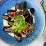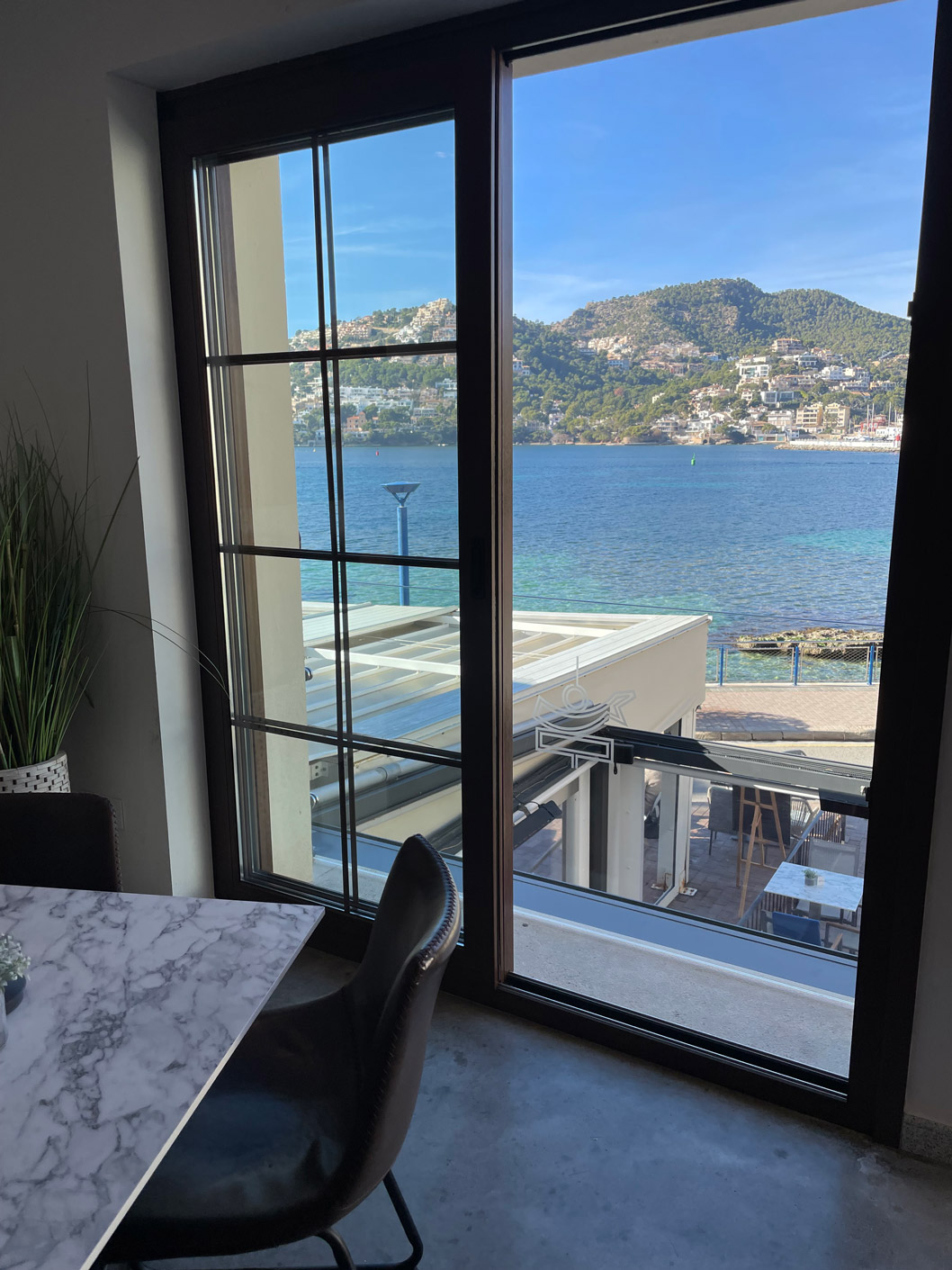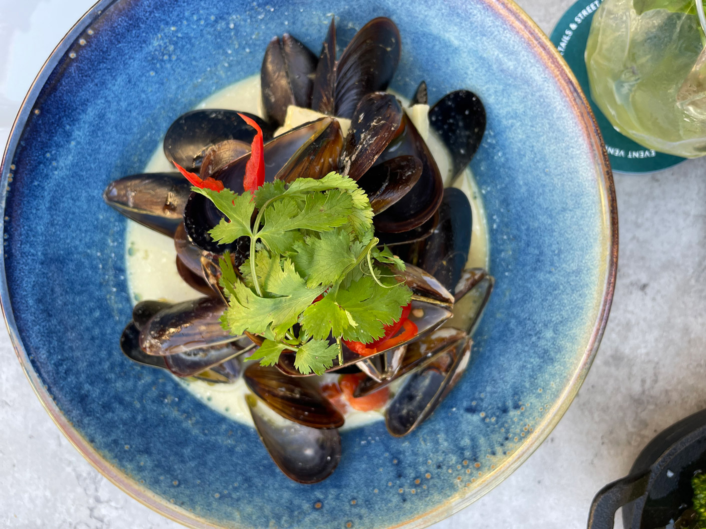 From the ‘Small Plates’ selection, we ate well-packed duck rolls with Asian apple slaw and spicy hoisin sauce (19 €) and Thai green curry mussels in a fragrant coconut broth (16 €) – a portion of naan bread with green olive aioli (6 €) was perfect for mopping up every drop of the broth. I was persuaded to try cuttlefish (sepia) and sobrasada tossed with chilli, garlic, and coriander, and drizzled with local honey (21 €); it’s not a dish I’d have chosen but it was a delicious marriage of Asian and Mallorcan ingredients, and I’d order it again.
