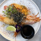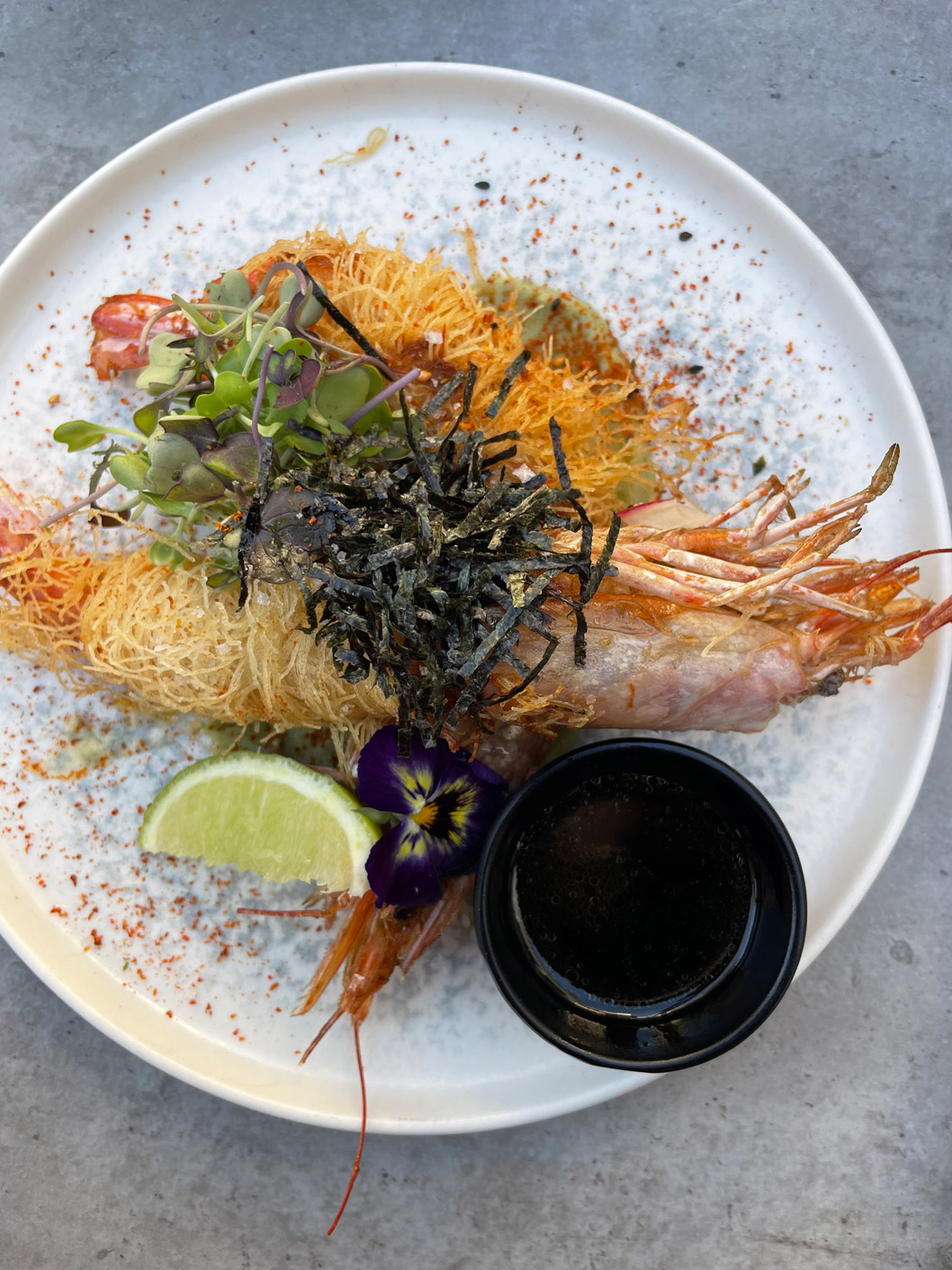 On the menu’s ‘Bites’ section we chose Ebi Wasabi – delicious kaitafi-wrapped prawns with whipped avocado and wasabi and ginger soy (15€ for two large prawns).