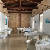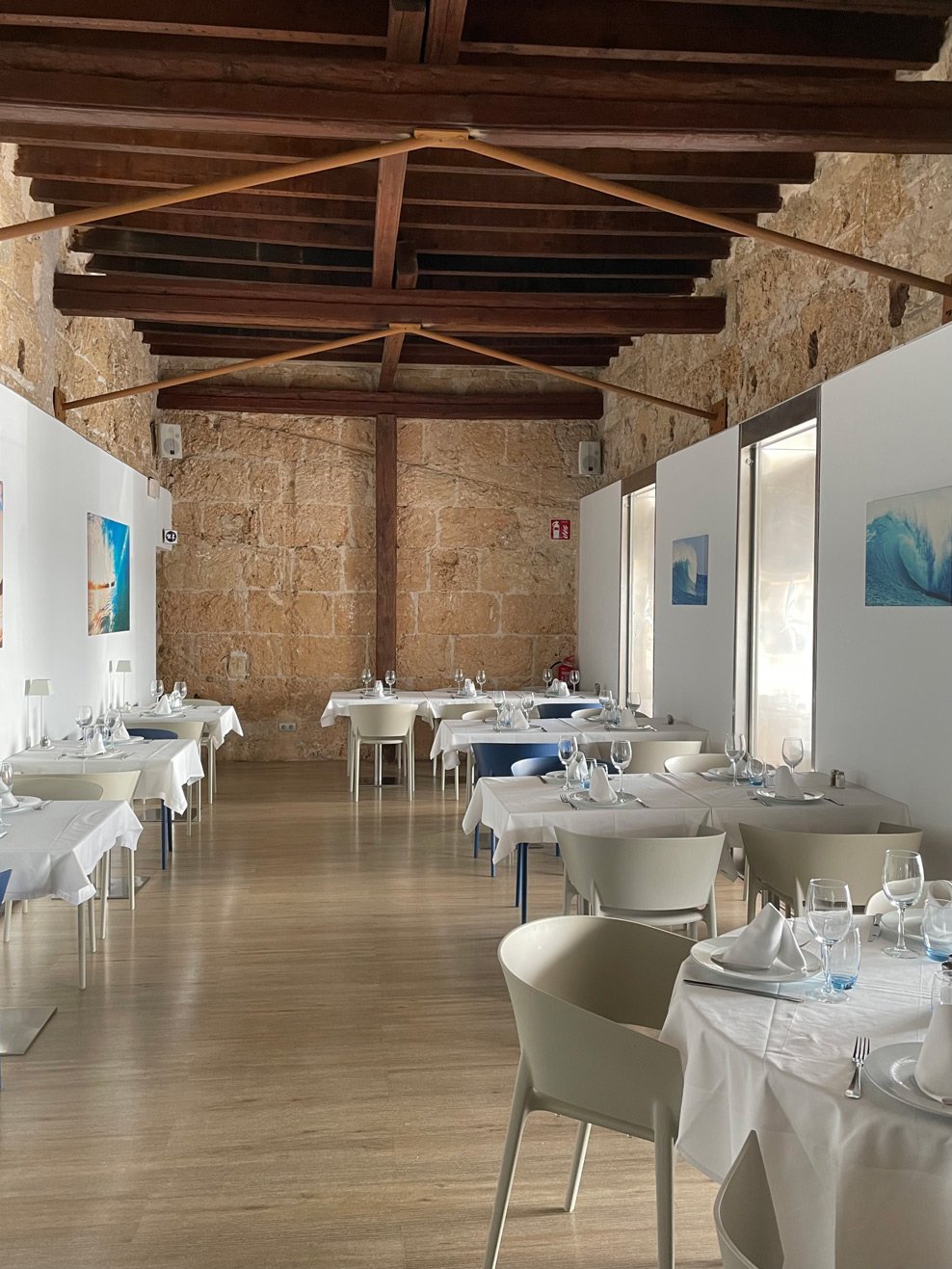 Indoors, the dining room is contemporary in style but retains exposed stone walls, beams, and metal tie bars. Light-hued wooden floors and large white wall panels accommodating artworks lighten this space. ‘Ola’ is the Spanish word for ‘wave’ and the restaurant’s name is reflected in the eye-catching wave-themed paintings. As in many seafood restaurants, you’ll spot a tank of lobsters.