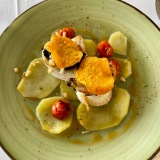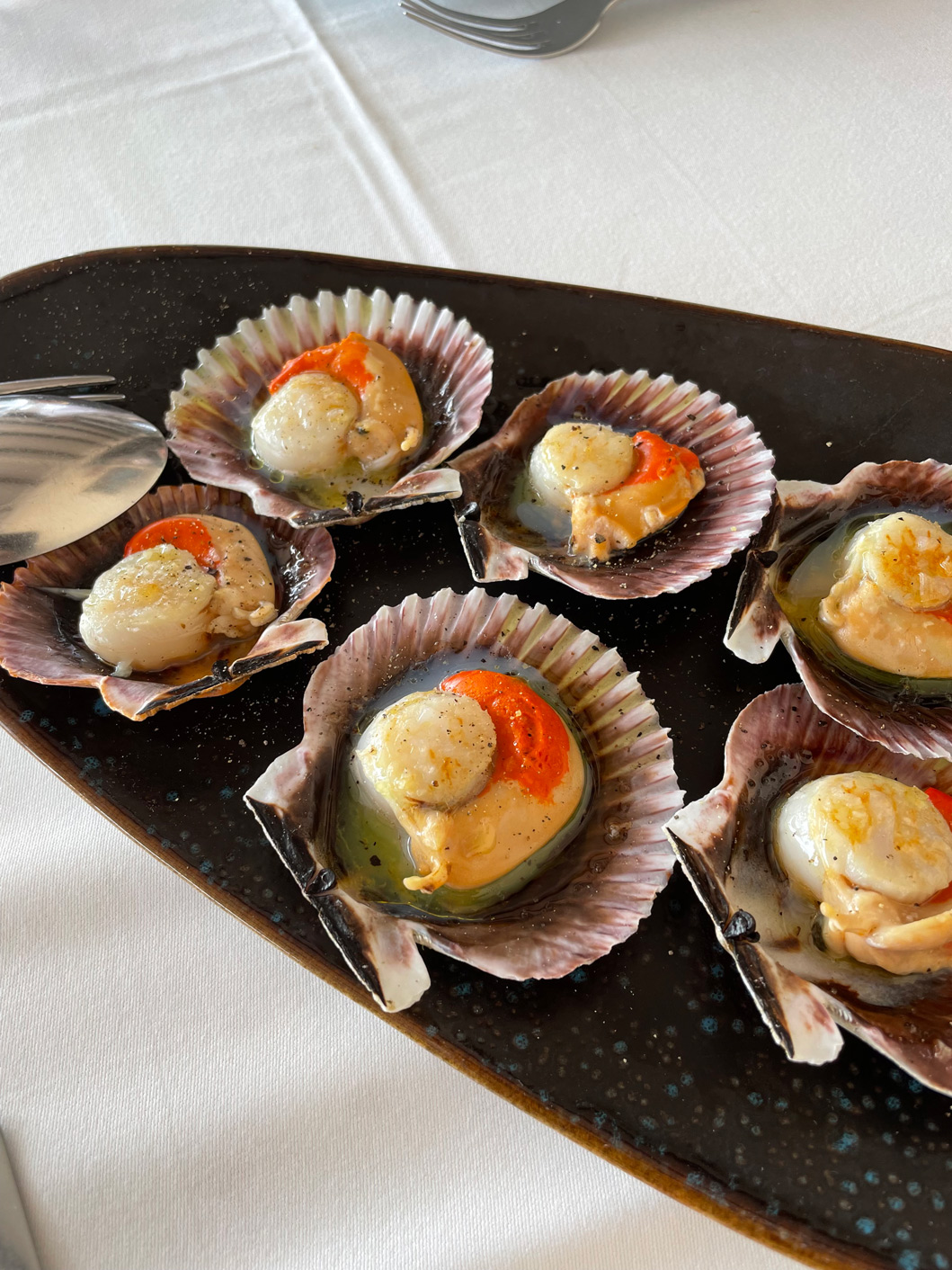 The à la carte menu is for lunch and dinner. Starters (priced from 16,35 € to 27,60 €) are designed to be shared. Unable to resist ‘zamburiñas’ (queen scallops), we shared the dish of six of them (18 €) – perfectly grilled and served on the shell.