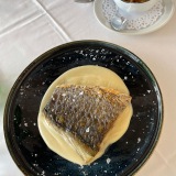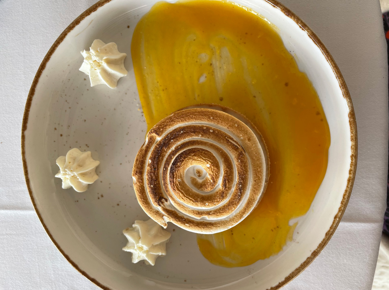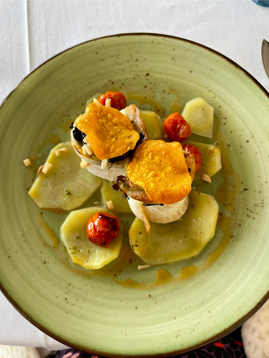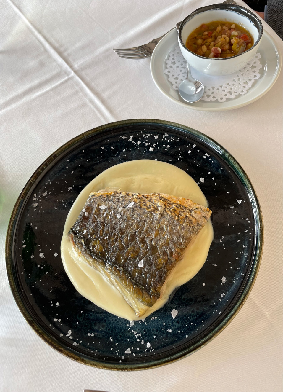 The menu offers three meat dishes, but we were there for fish, choosing Mallorcan-style sole with toasted almond velouté and paprika oil, topped with sweet potato chips (26,90 €) and corvina on a parsnip cream with a vinaigrette of bacon, garlic, and pine nuts (27,65 €).