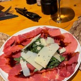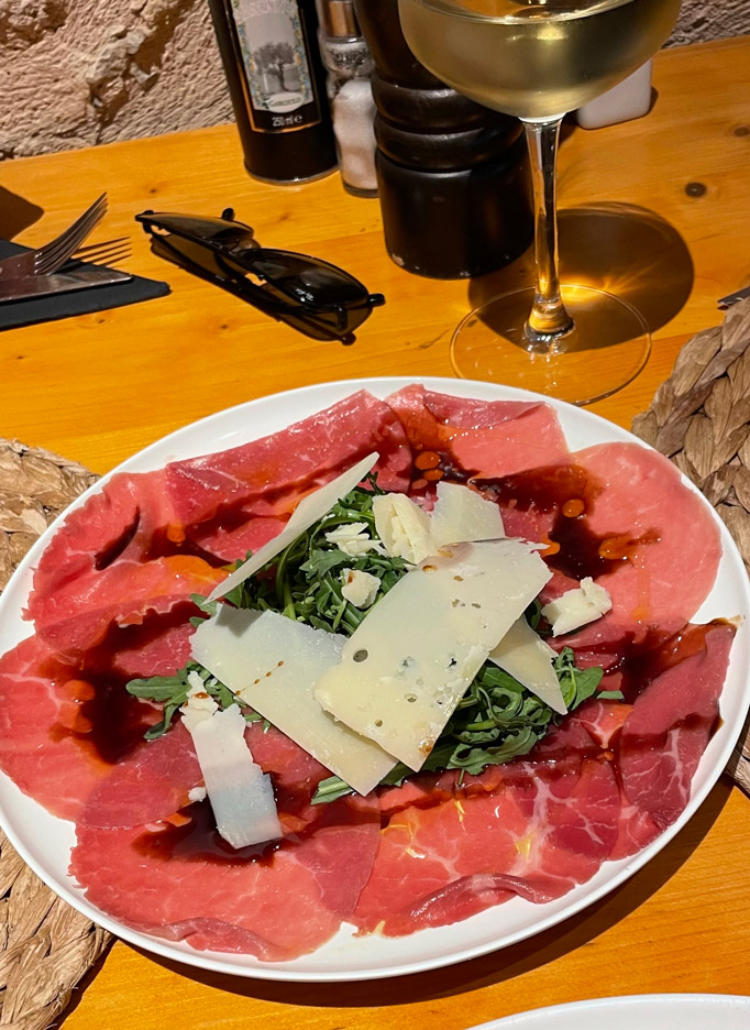 We began by sharing a focaccia with extra virgin olive oil and oregano (6€), and beef carpaccio with balsamic vinegar, rocket, Grana cheese, and extra virgin olive oil (12€).