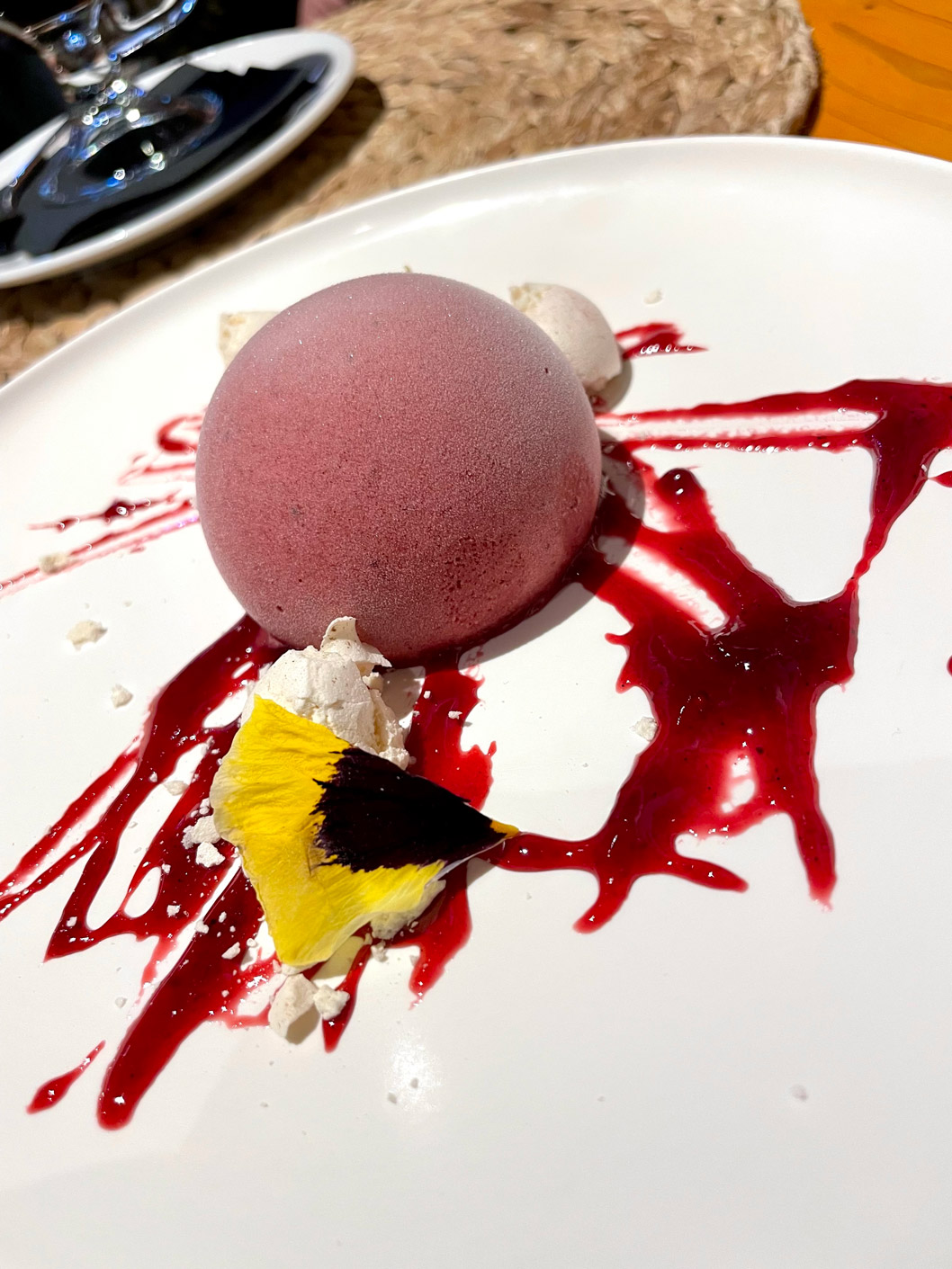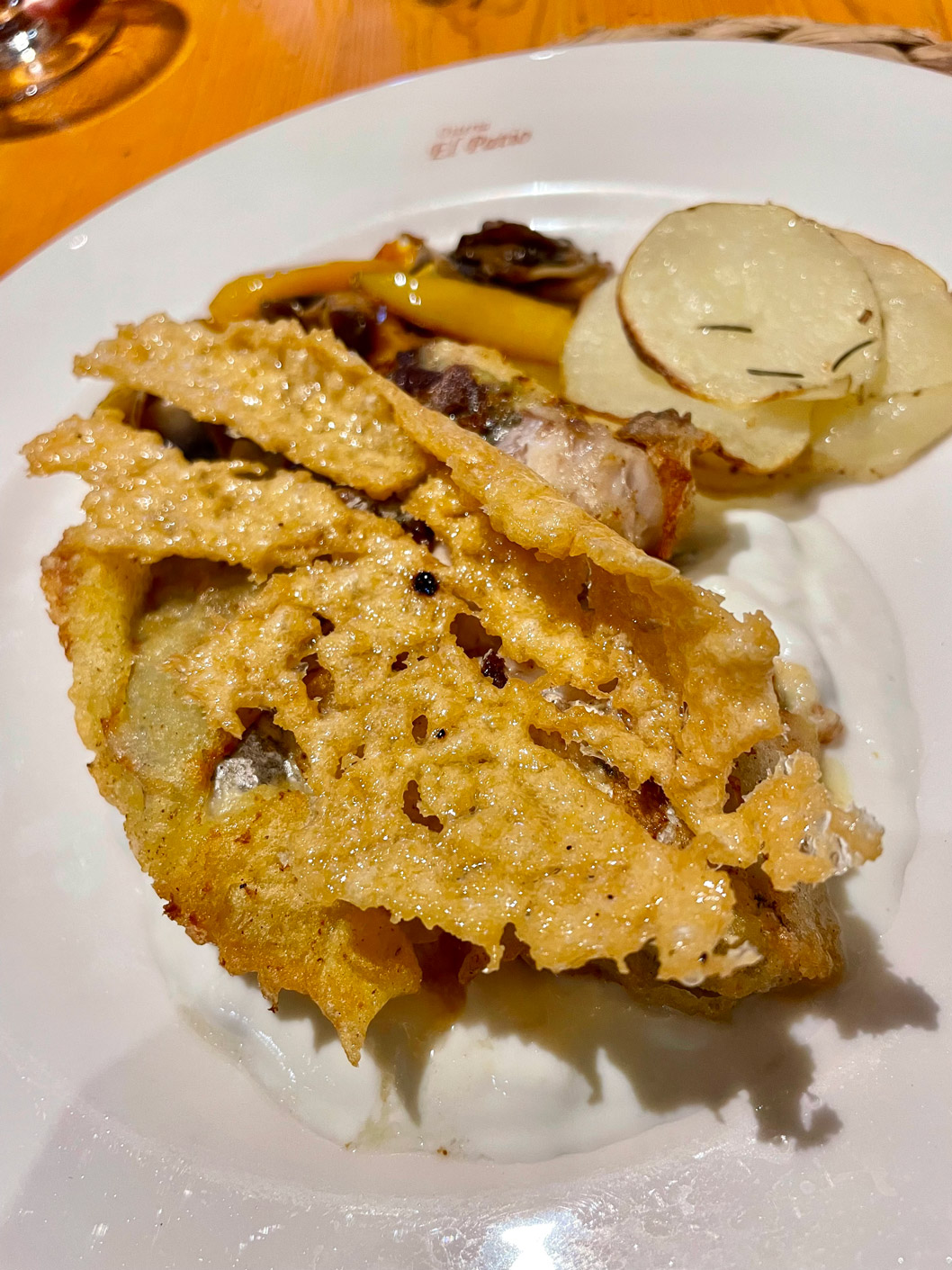 I chose a beautifully cooked piece of hake in the lightest saffron tempura with yogurt sauce – containing tiny pieces of cucumber – sautéed vegetables and potato millefeuille (24€). The slight sharpness of the yogurt sauce was the perfect foil for the tempura.