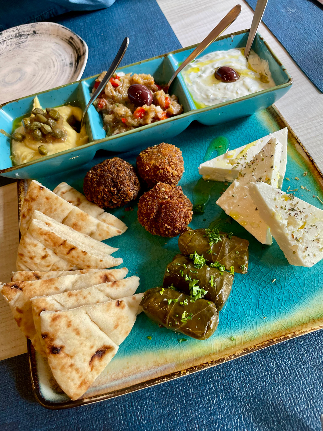My two girlfriends and I wanted authentic Greek dishes, so we turned to Palet’s à la carte menu, which offers the classics of the country’s cuisine. To begin, we shared a plate of mezze, which included good pita bread, some delicious feta cheese, Santorini fava, grilled eggplant, keftedes, dolmadakia, and tzatziki. We all agreed this was a tasty starter.