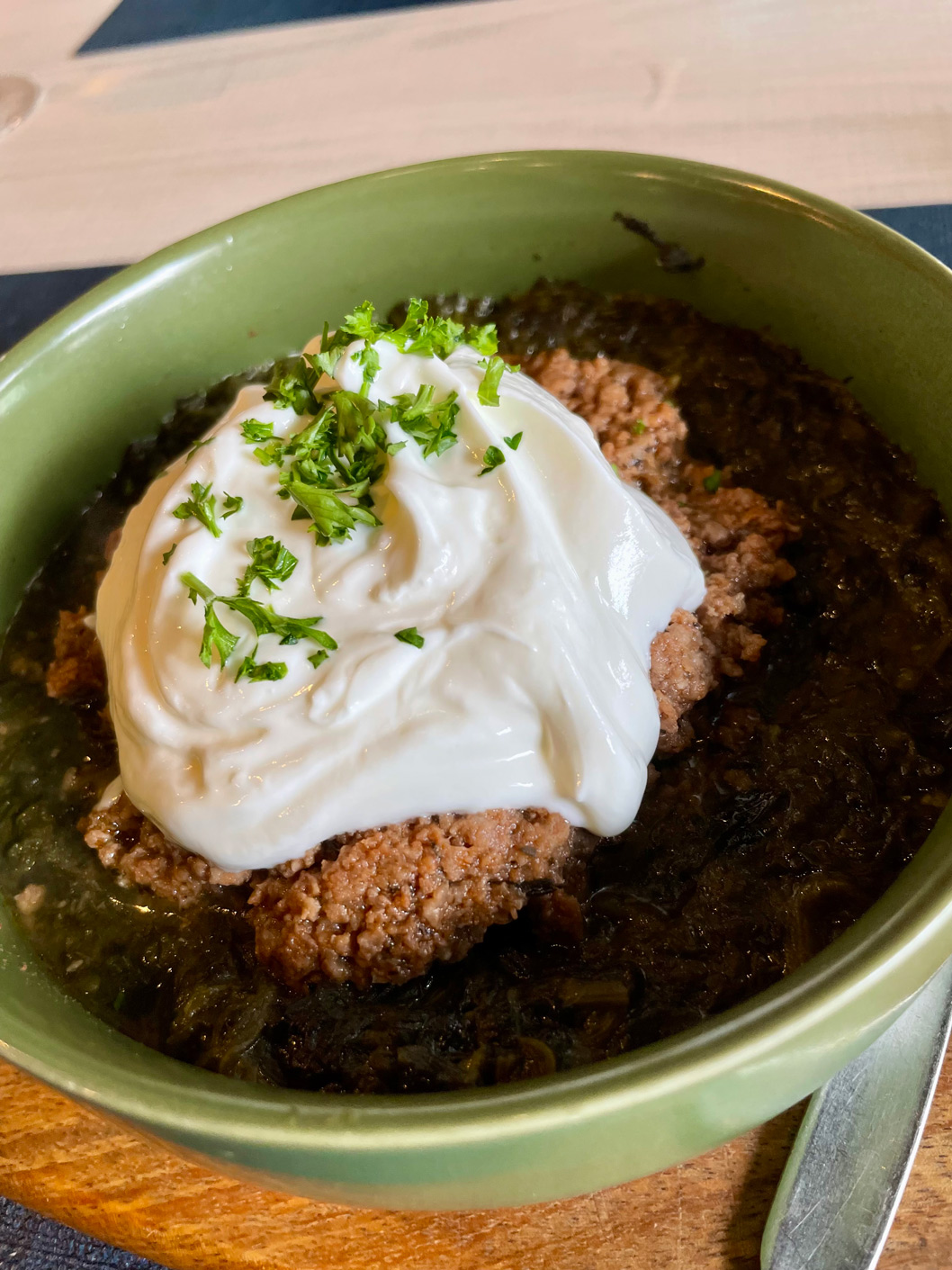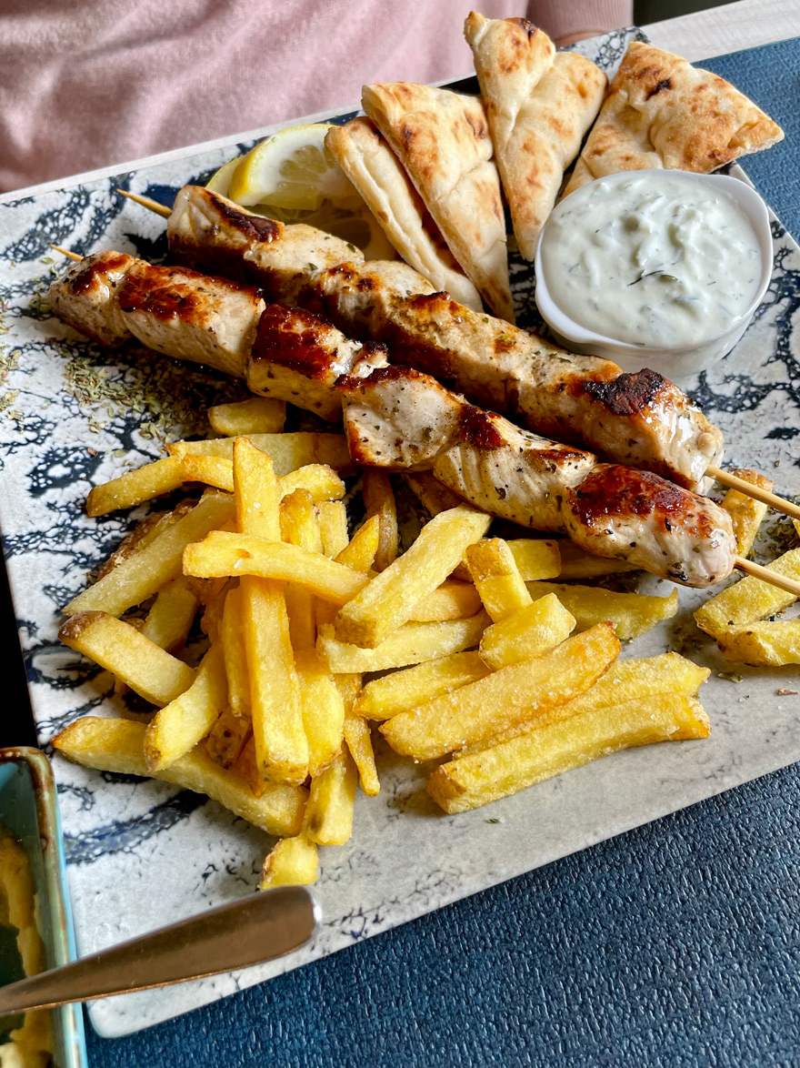 For the main course, I chose Istanbul casserole – a very satisfying dish of stewed spinach and minced beef, topped with Greek yogurt (12,90€). My friends enjoyed ‘Saganaki’-style prawns in a home-made tomato sauce with herbs and feta cheese (14,90€) and souvlaki – marinated pork skewers (13,90€). I was pleased to note that the food was hot rather than lukewarm, as I’d once found on my brief, long-ago visit to Athens.