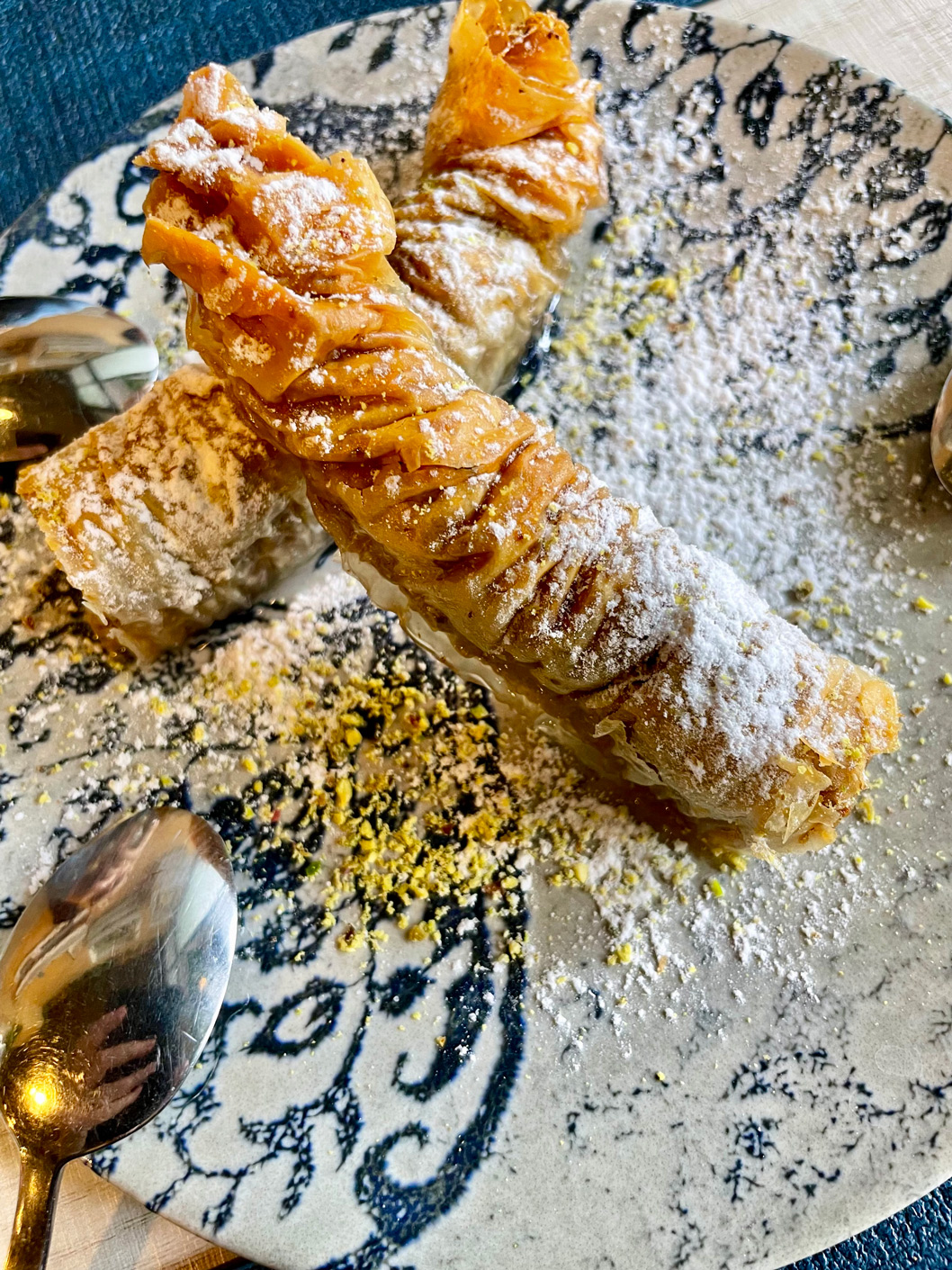 We had little space for one of the home-made desserts but were persuaded by our server to share a portion of baklava (5,90€). It’s a dessert that’s a little too sweet for my taste (I’m more of a savoury girl), but we finished it between us, and if you like baklava, you’ll enjoy this.
