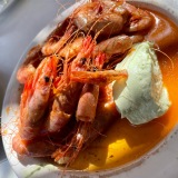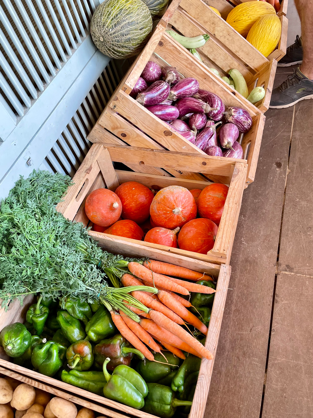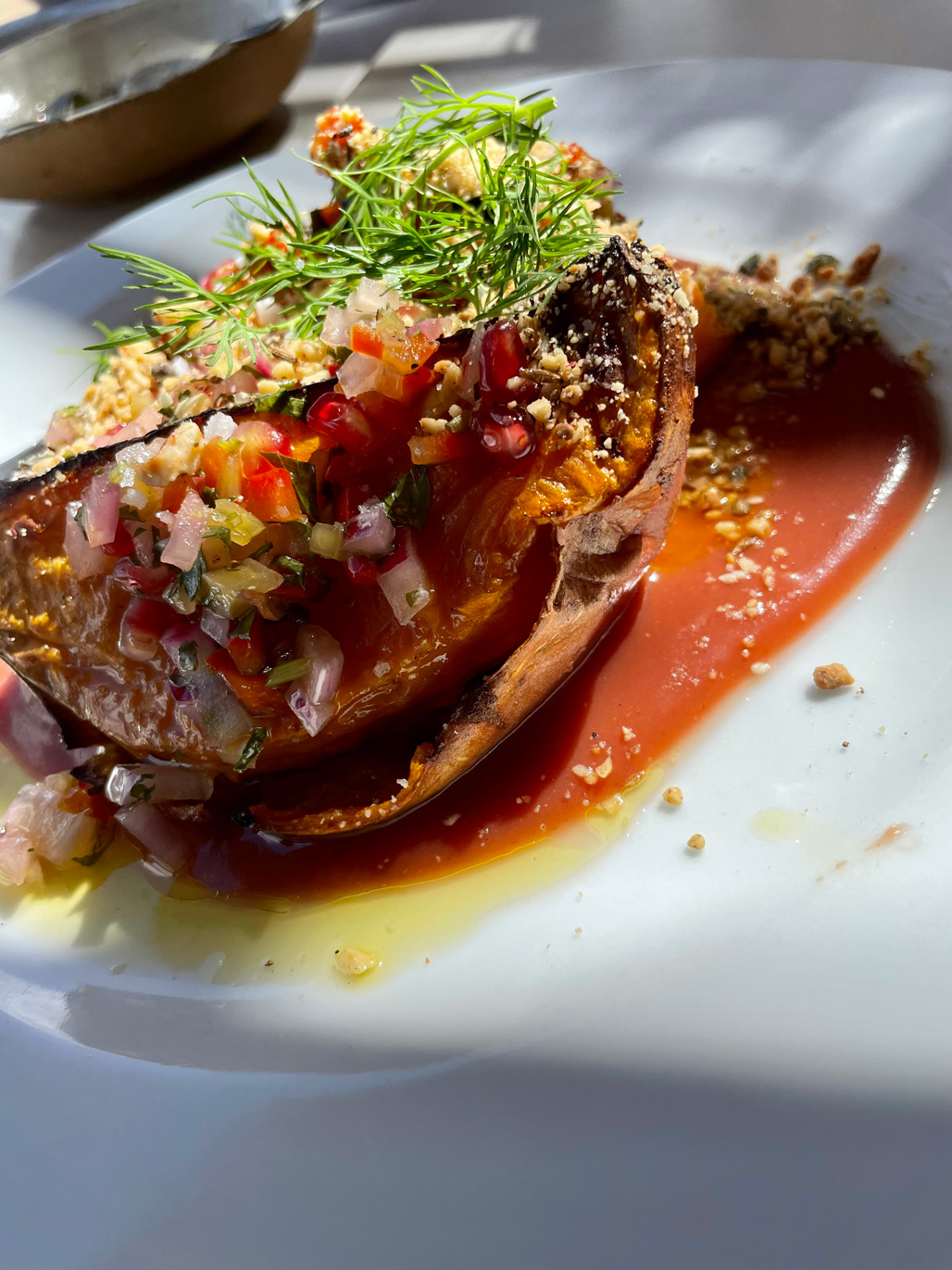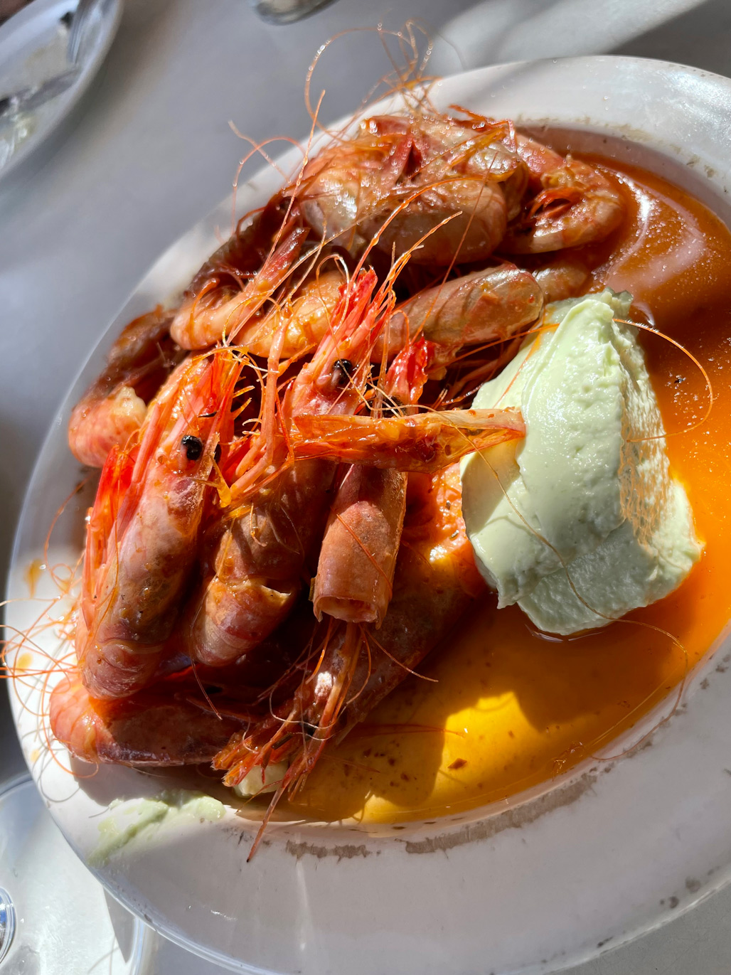 Our lunch began with moreish toasted sourdough bread, garlic oil, and thyme. Between the four of us, we had ‘Big Burrata’, with melon, mustard seed pickles, and basil pesto; charcoal-roasted courgette, feta cheese, kale, and crunchy lentils with tahini sauce; charcoal-roasted sweet potato, fruit chutney, with pomegranate and dukkah, and we couldn’t eat in Sóller without ordering a portion (200g) of the local prawns stir-fried with chimichurri and coriander aioli. Plenty of lip-licking – and in the case of the prawns, finger-licking – featured.