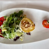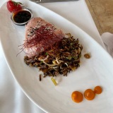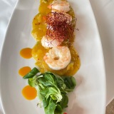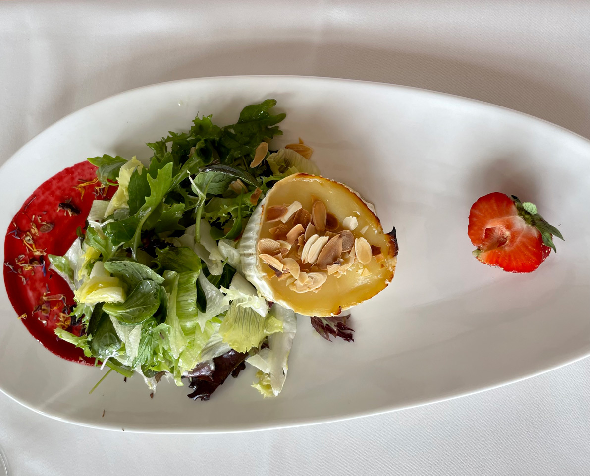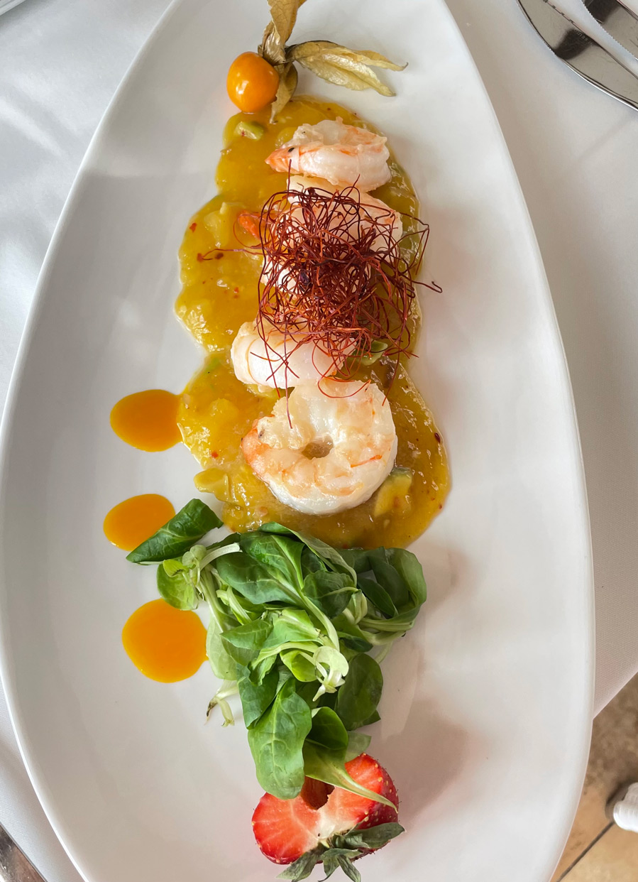 We had two starters: goat cheese baked in the oven with honey, almonds, and seasonal salad (18 €) and five black tiger prawns with salad of avocado and mango (20 €). Portions are generous – as they often are in German-owned restaurants – and either of these starters would have been shareable.
