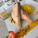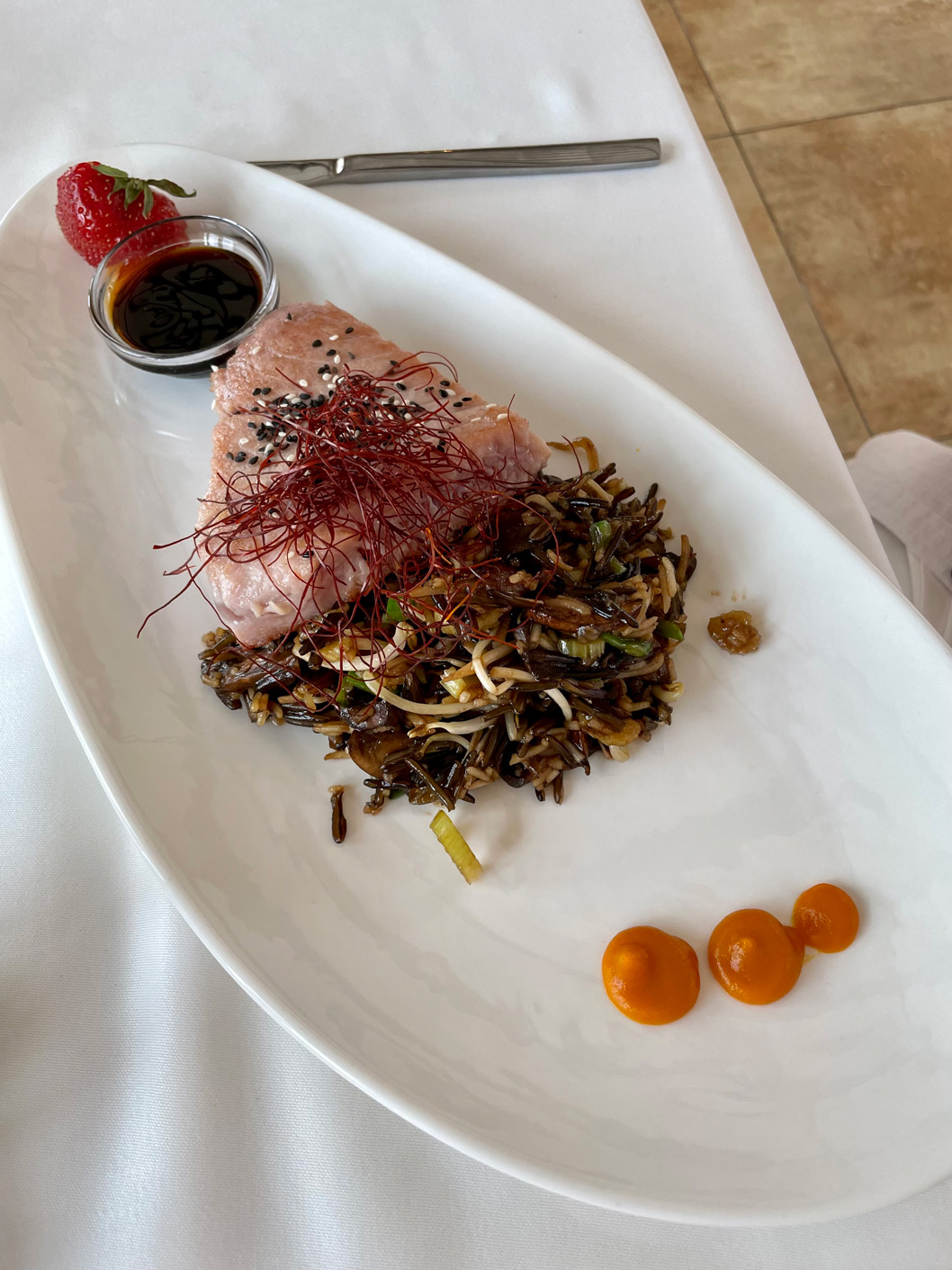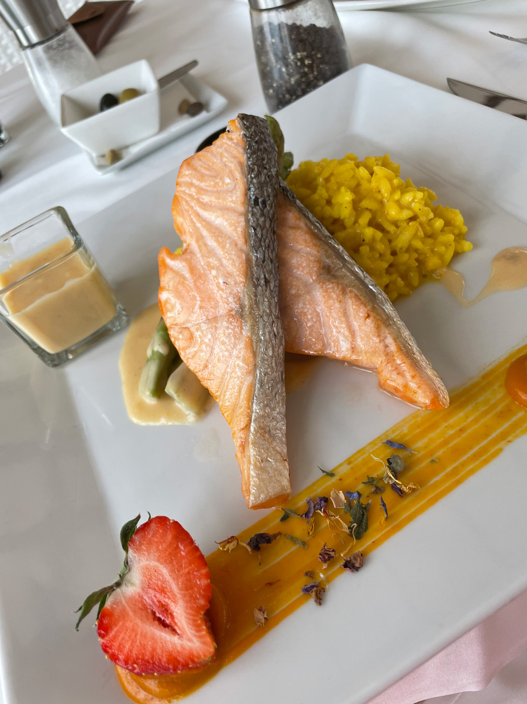 Our main courses were wild salmon with green asparagus, saffron risotto, and a Beurre Blanc sauce (27 €), and yellowfin tuna steak with Asian vegetables, wild rice, and teriyaki (31 €). Again, portions were generous. So generous, we had to miss the desserts (ranging from 8 € to 10 €) – although the home-made black and white ‘Valrhona’ chocolate mousse with fresh fruits was tempting.