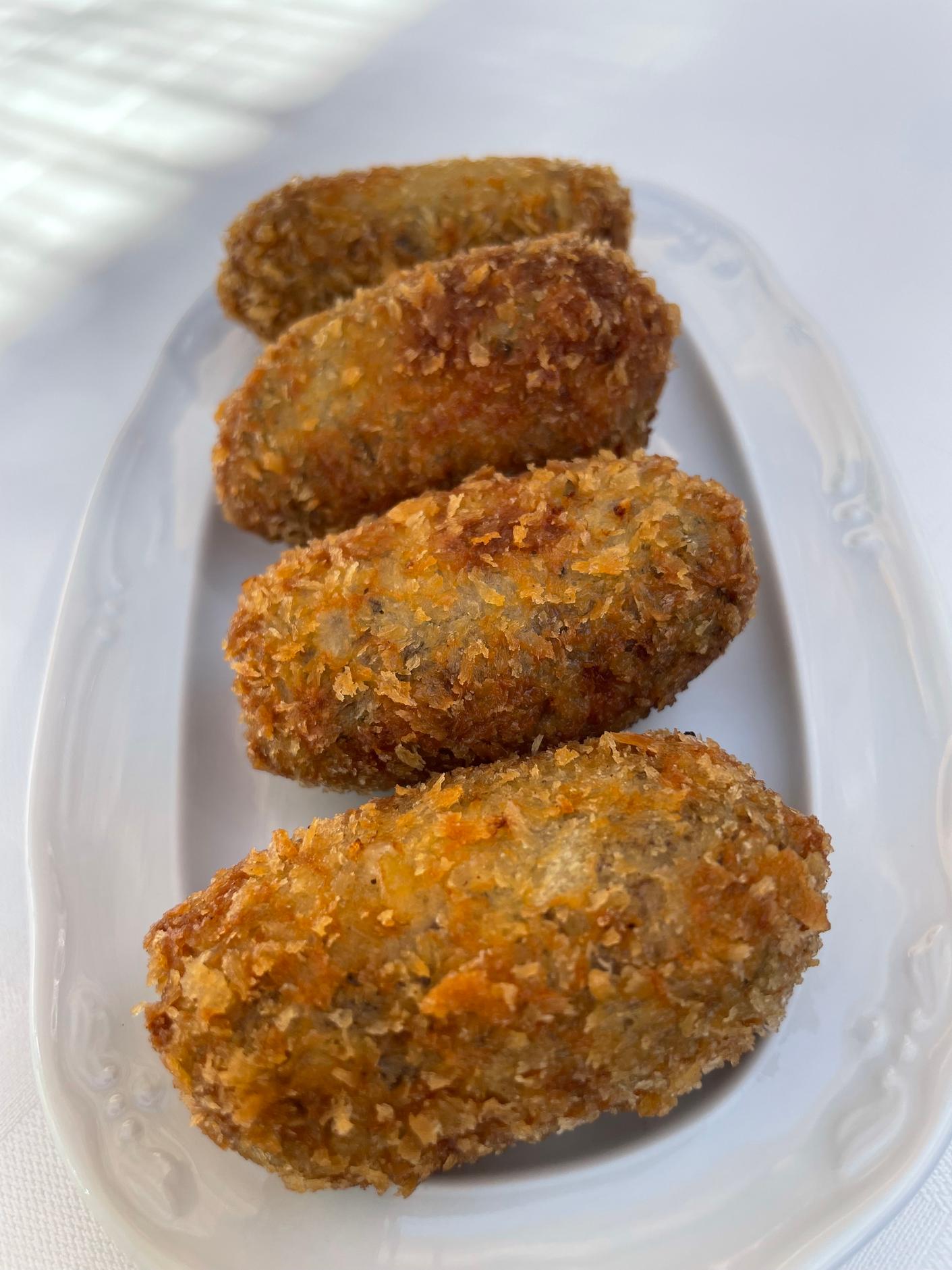 The starters are to share and include a charcuterie plate (19€), escalivada with bread (8€), and home-made mushroom croquetas with saffron aioli (12€). We shared the latter, which were full of flavour and pieces of mushroom. There are also salads and a soup (gazpacho) as an alternative starter.