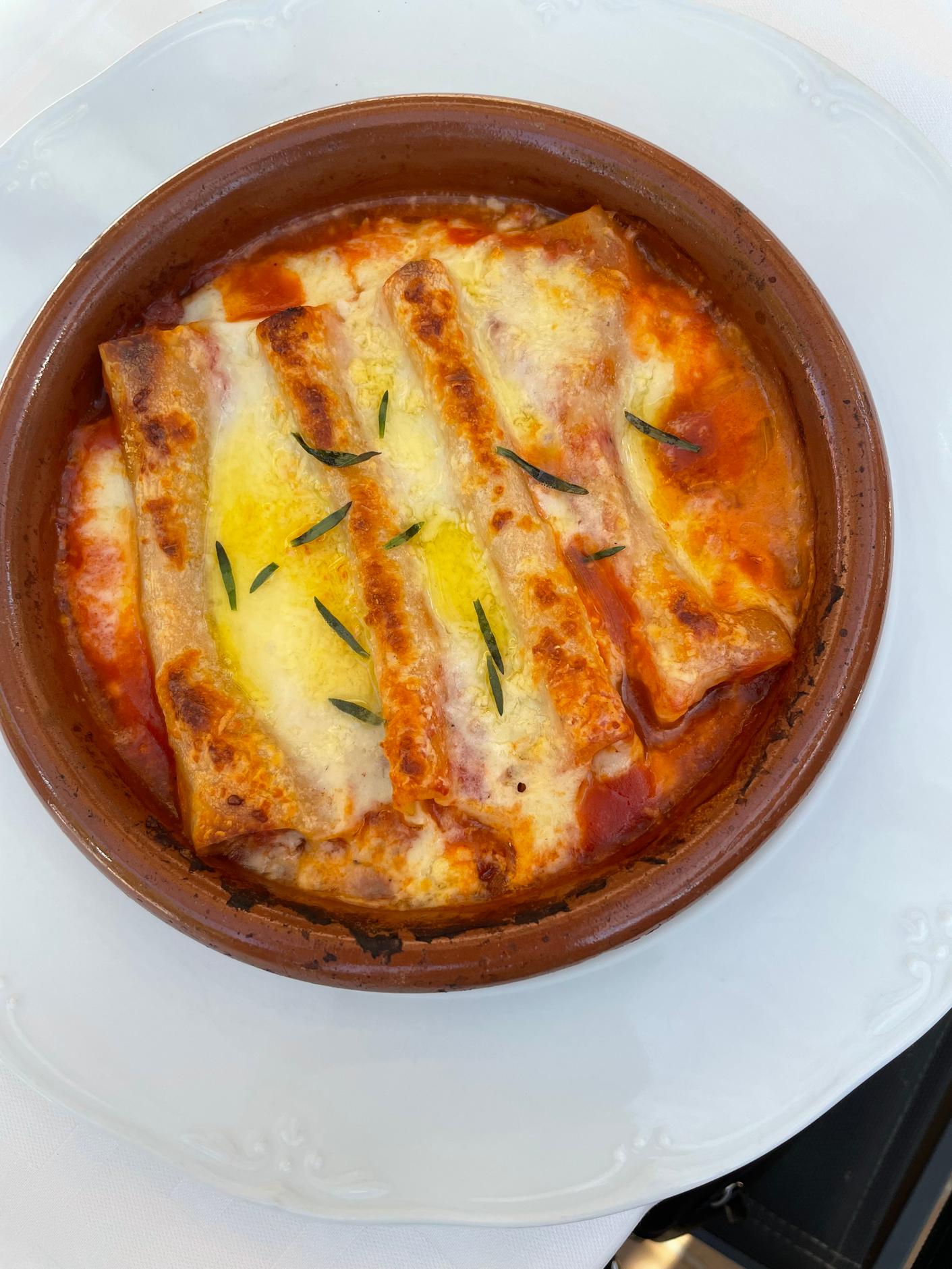 The main course dishes were so tempting: would it be deboned slow-roasted leg of lamb with a herb crust (28€), chicken tagine with plums, apricots, and almonds (21€), or rabbit cannelloni (28€)? I never buy or cook rabbit at home, so I chose the latter. Noticeably flavoured with tarragon and orange and gratinated with cured Mahón cheese, it was delicious.