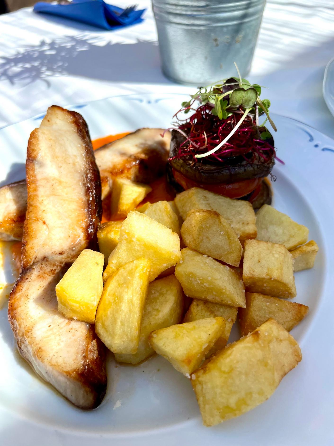 My companion chose corvina with home-made romesco sauce served with attractively presented tumbet and fried potatoes (25€).