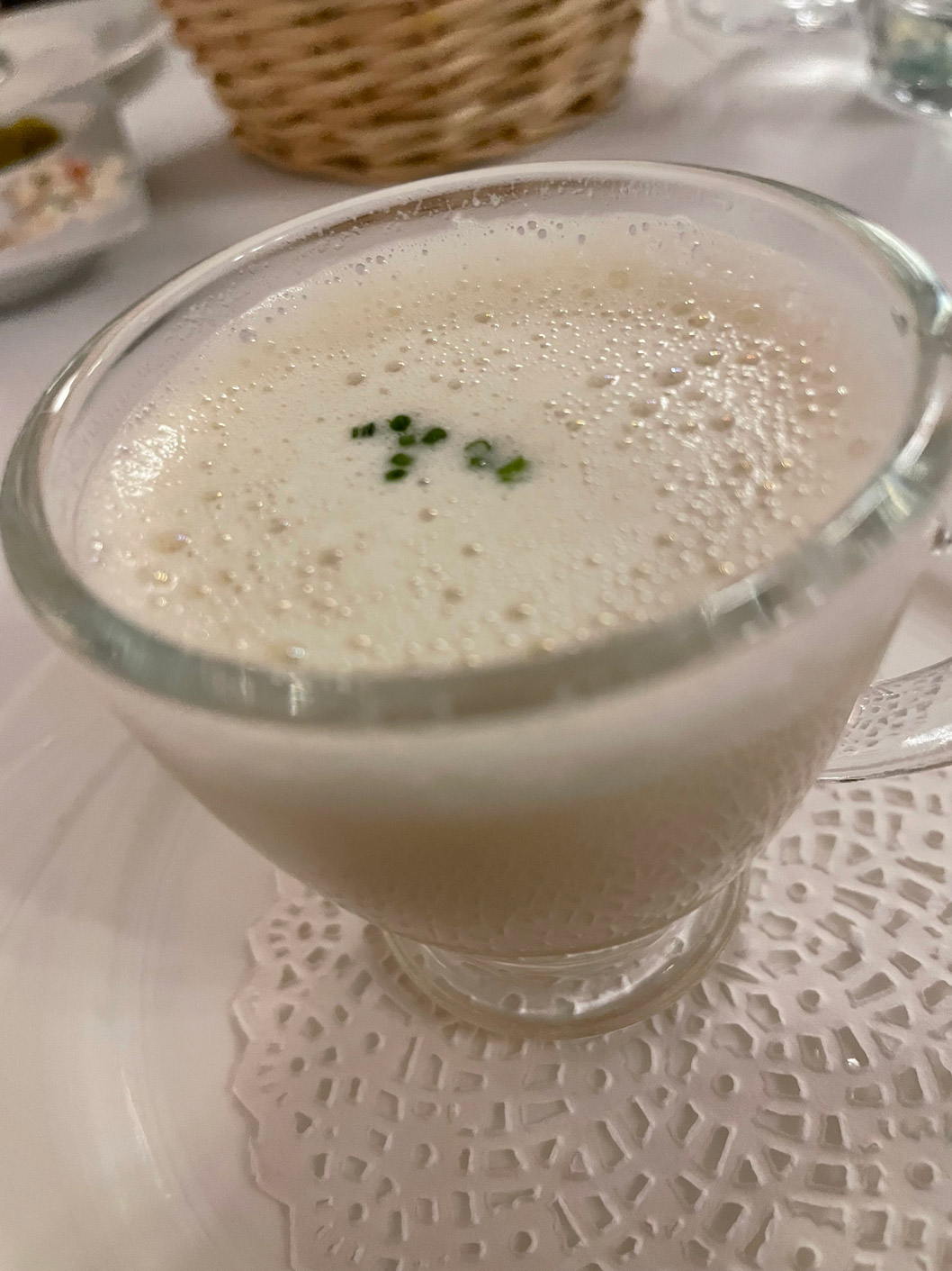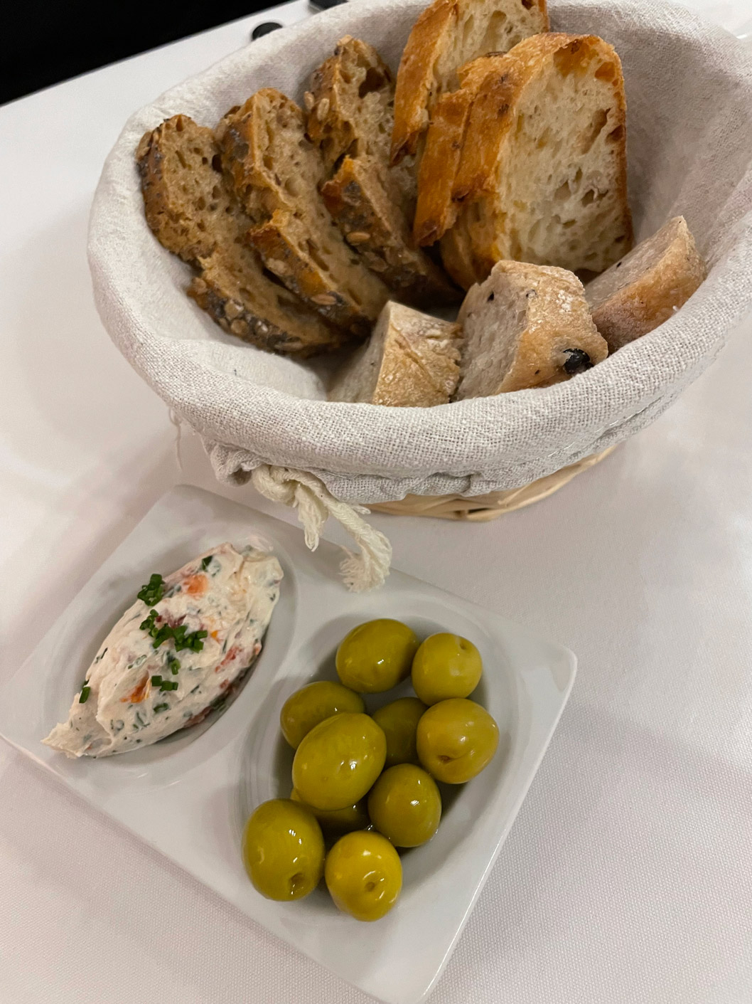 We began with a class of Veritas ´rosado´cava (5,10 €), while considering the menu and that day’s specials. A basket of three types of bread arrived with green olives and a fresh cheese spread – a pleasant change from aioli (3,50 € per person). After ordering, we sipped a complimentary appetizer of turnip soup.