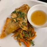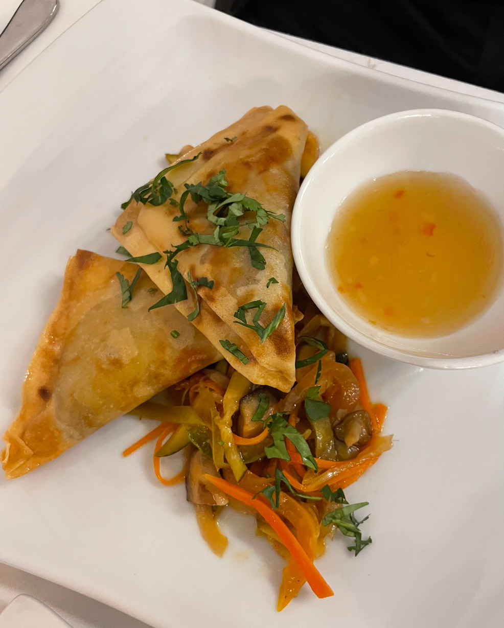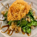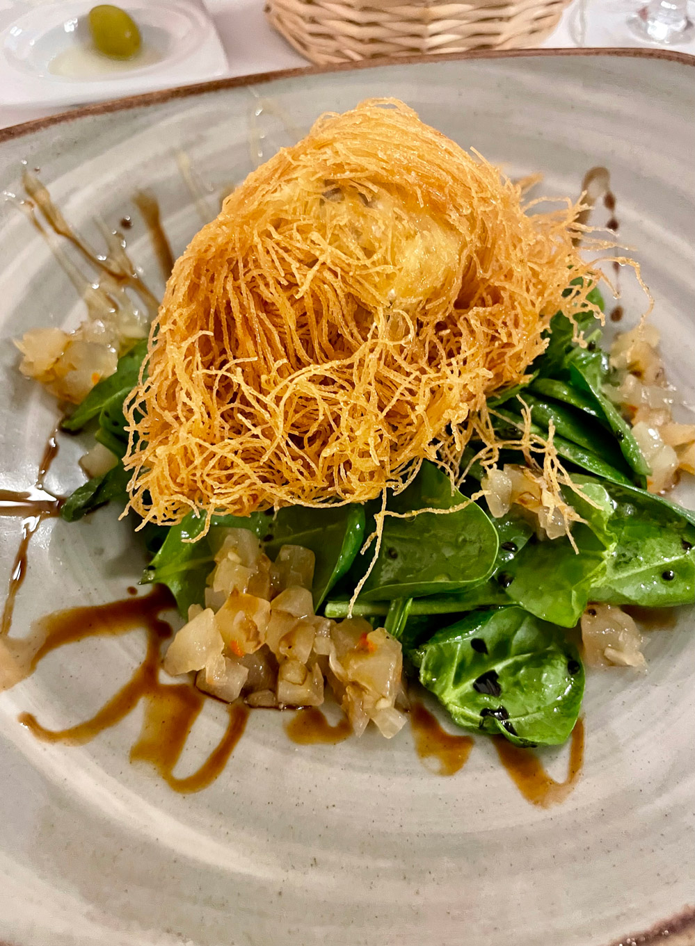 From the interesting variety of starters, I chose the goat’s cheese crotin generously wrapped in kataifi on a bed of baby spinach leaves with pear chutney (15,50 €). This tasty, multi-textural dish would be enough for two to share. Across the table, the Iberico pork samosas with an Asian salad were a hit (17,50 €).