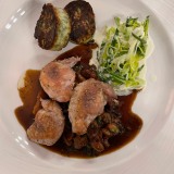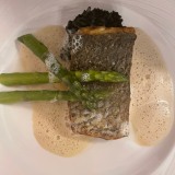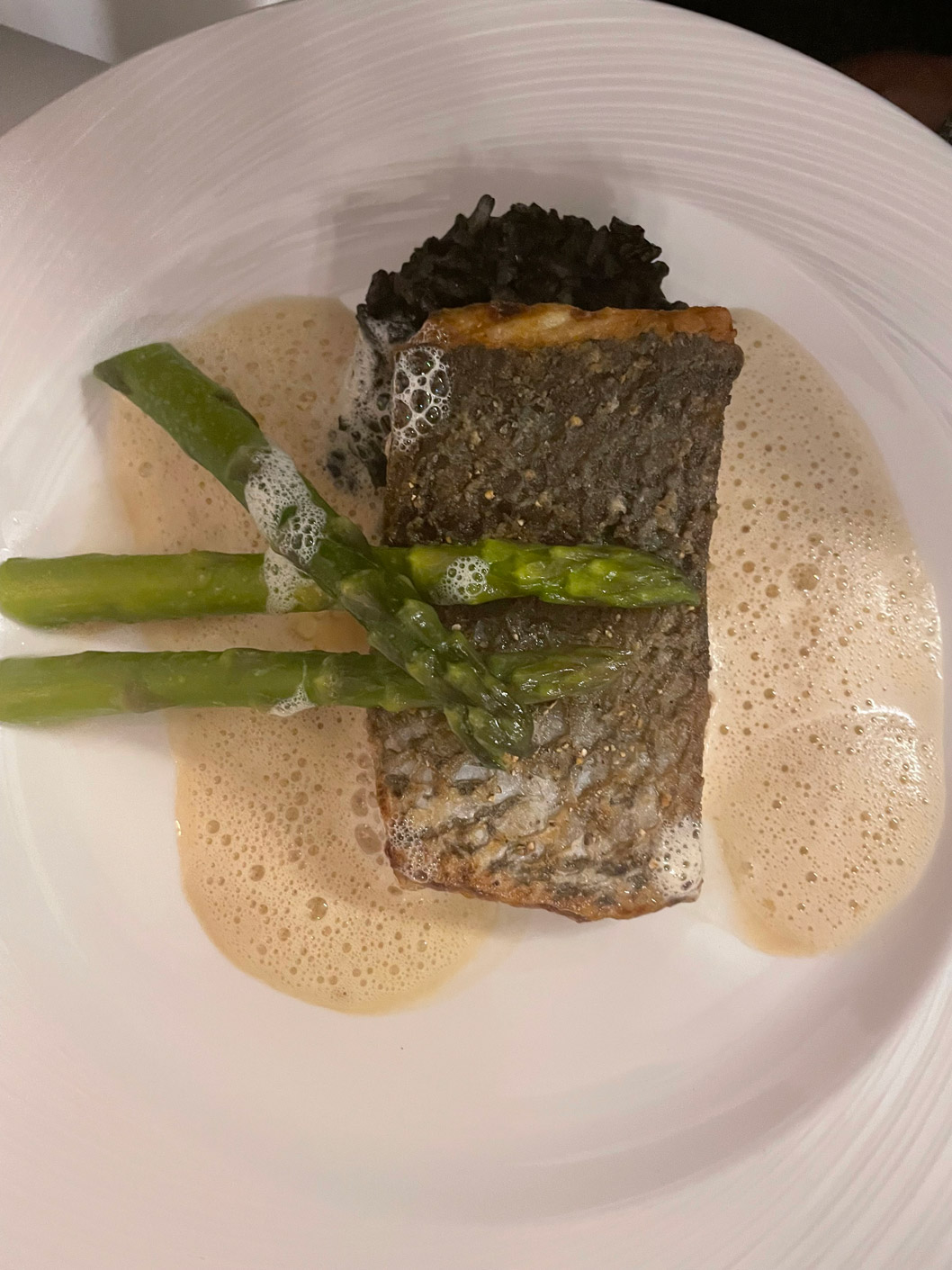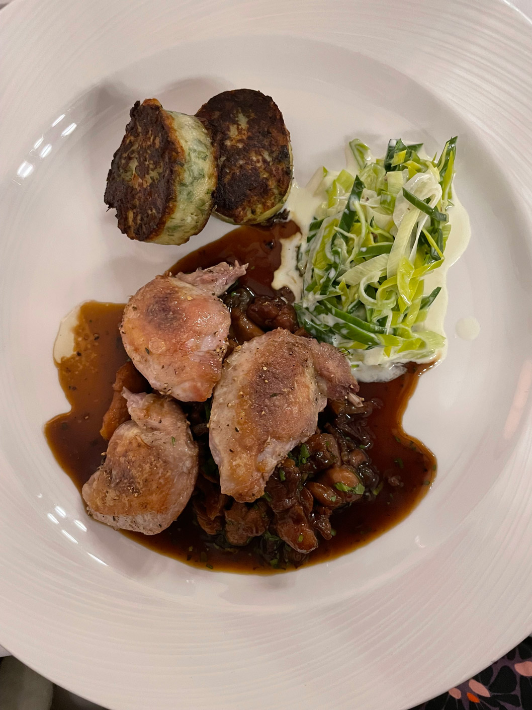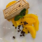 Our main course dishes were fillet of sea bass with black risotto and a lobster sauce (24,50 €), and coq au vin made with quail rather than the traditional rooster or chicken. (24,50 €). Both dishes were delicious and well presented, with flavourful sauces.