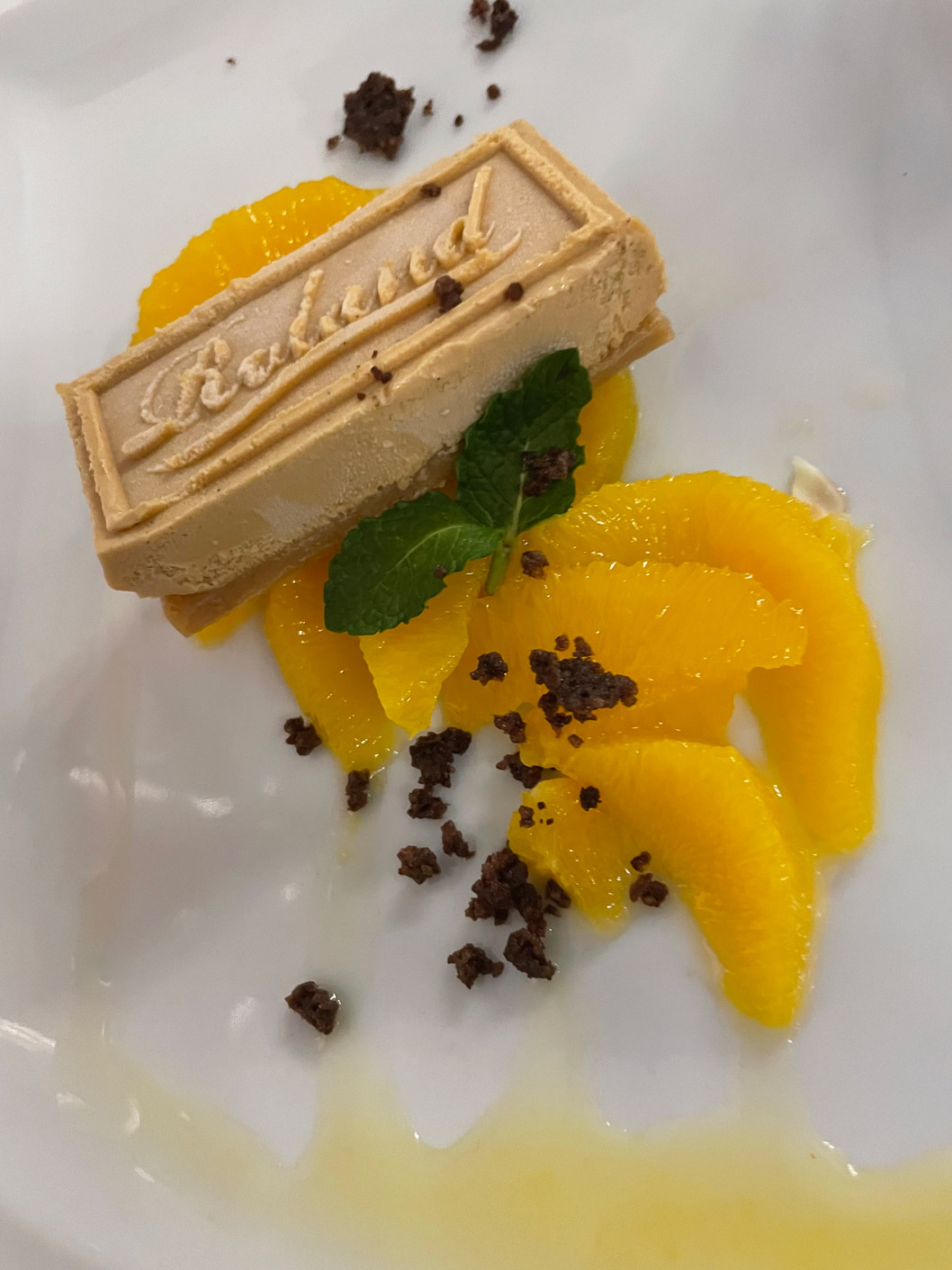 With barely any space for dessert, we gamely ventured into a semifreddo of chocolate and caramel with an orange salad to counter the richness (11,50 €) and crème brûlée of passion fruit with tonka bean ice cream and strawberries (11,50 €).