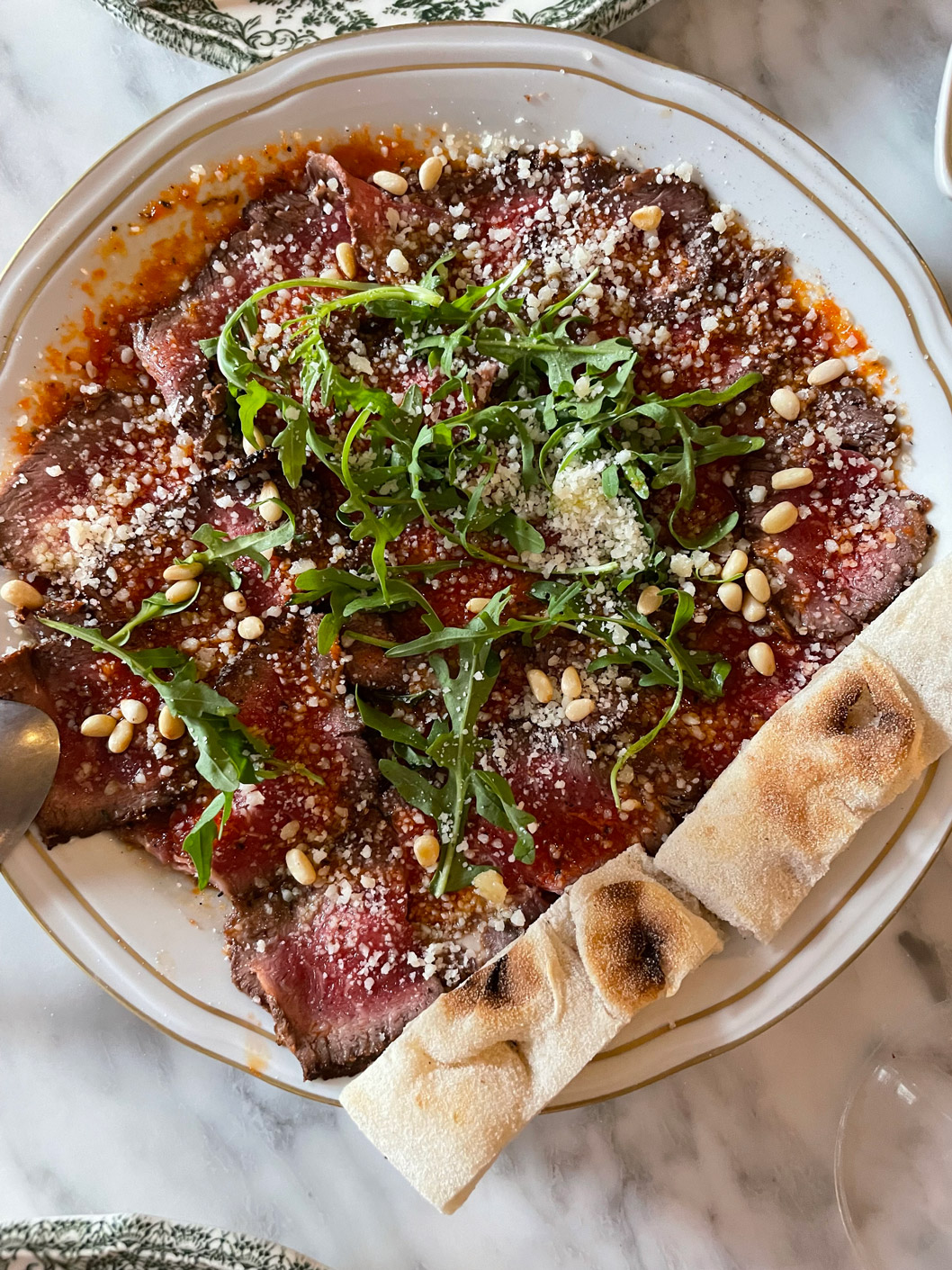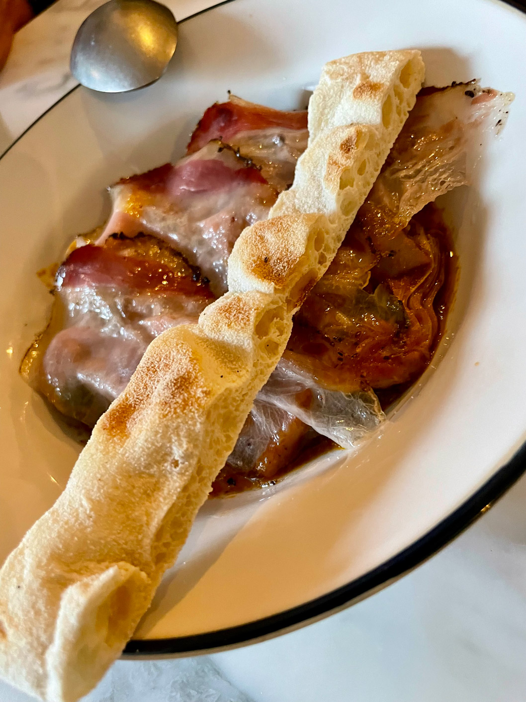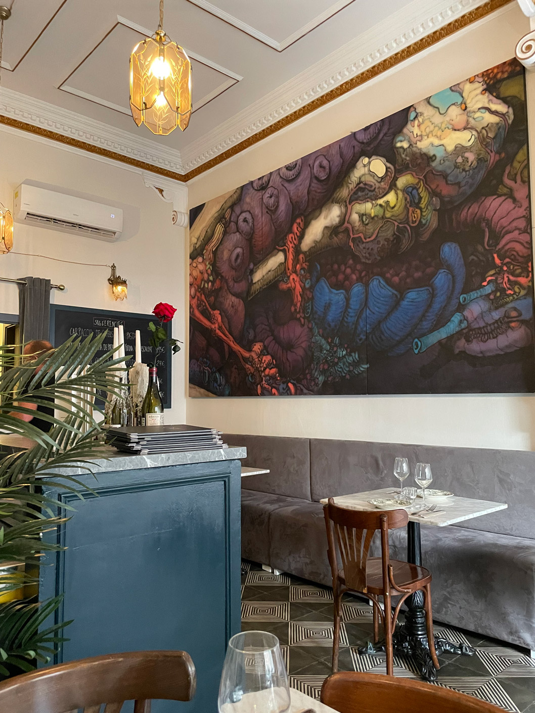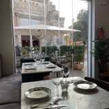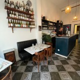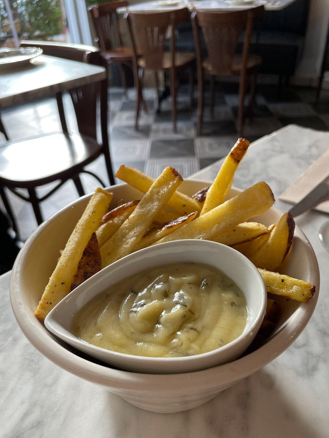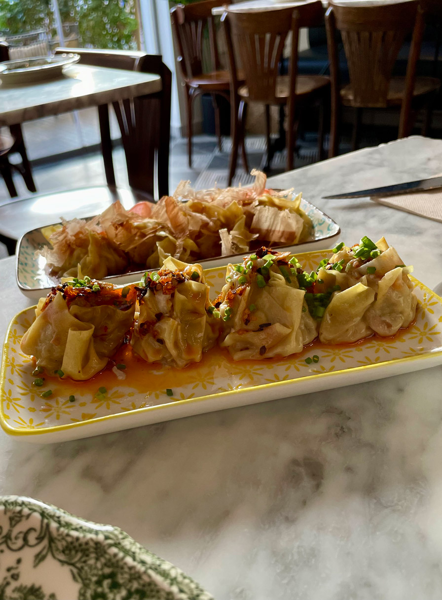 We’ve not eaten on CRU’s terrace, preferring the ambience of the dining room. It’s a neat space, with contemporary black-and-white floor tiles, marble-top tables, and a mix of banquette seating and wooden, bistro-style chairs. Pretty plates, reminiscent of an English tableware design, are from Portugal.