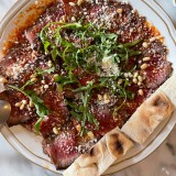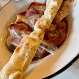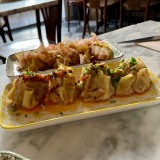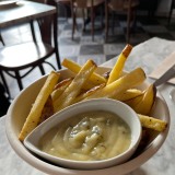 The food is perfect for sharing. We went feeling hungry last week and started by sharing two types of well-filled home-made gyozas: pork with a spicy oil (four for 8€) and prawn with Japanese BBQ sauce (4 for 10€). Alongside these, we had a generous portion of their must-try home-made fries (7€) with a bowl of Béarnaise sauce for dipping. Next, we shared a portion of prawns, artichokes, and guanciale, with home-made bread (18€) and a Mediterranean beef tataki (17€) marinated with dried tomato, lime, Parmesan, and basil, and served with tiny triangles of fried bread.