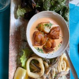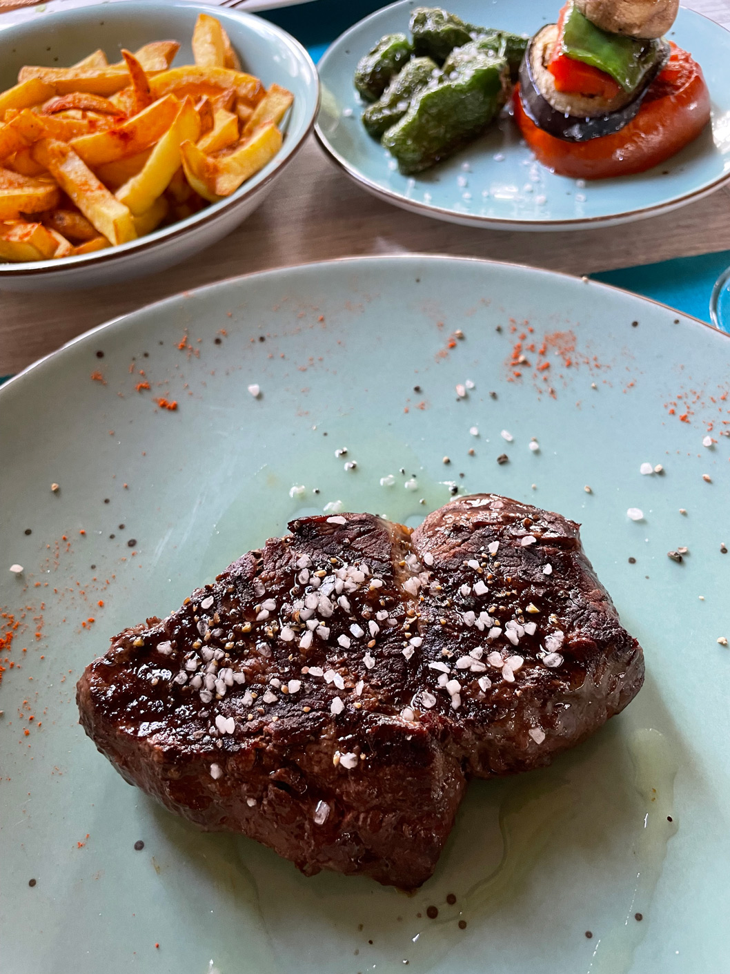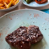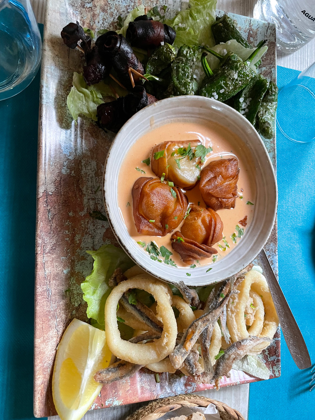 We chose mixed tapas to share, of dates in bacon (slightly overcooked), pimientos de Padrón, prawn ‘sacks’ in a pink sauce (I’d have preferred them without the sauce), boquerones, and squid rings. I rarely eat beef but had a grilled fillet steak which was perfectly cooked and accompanied by grilled vegetables. My companion had a decently cooked sole and chose chips as his accompaniment.