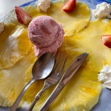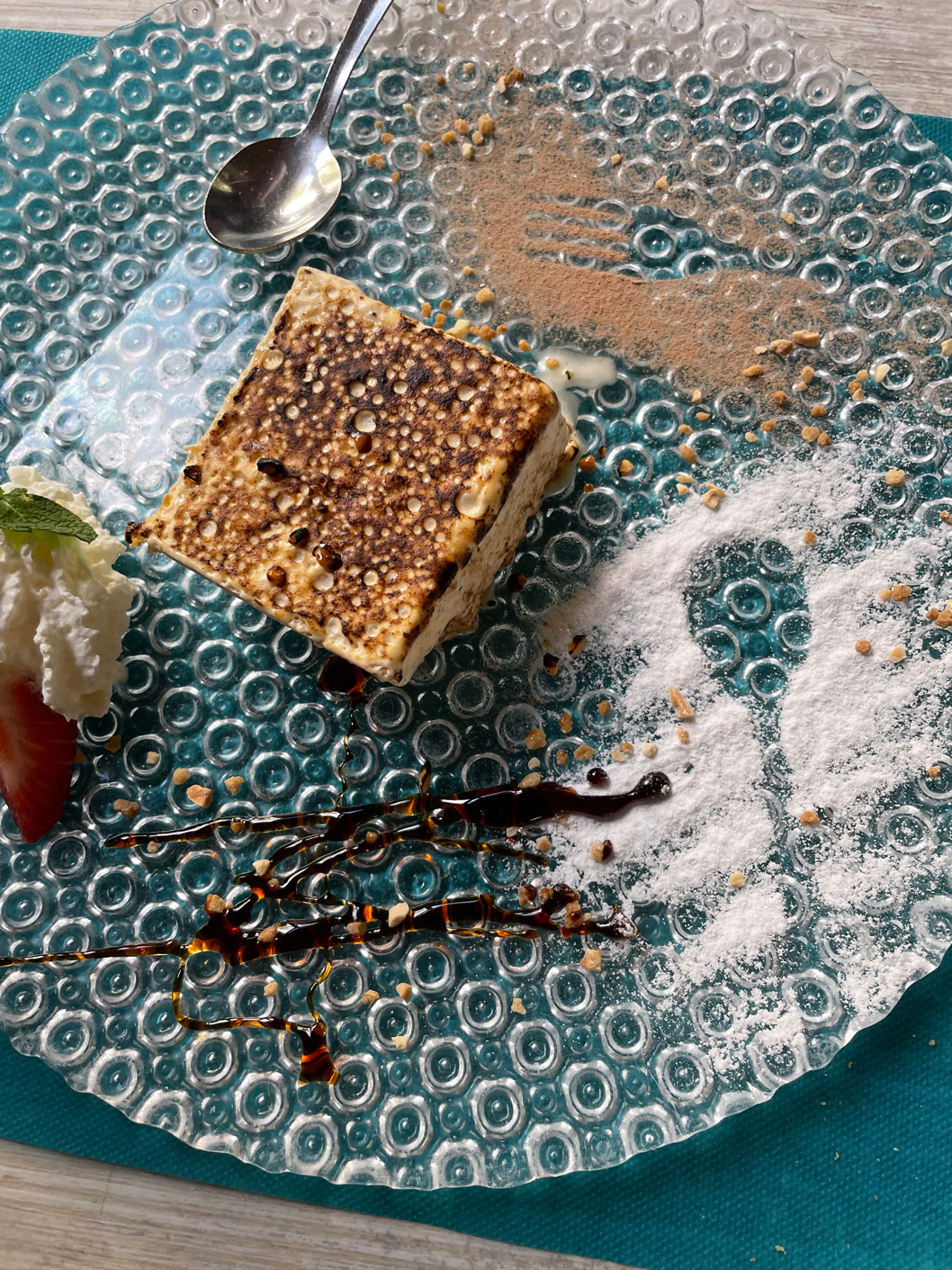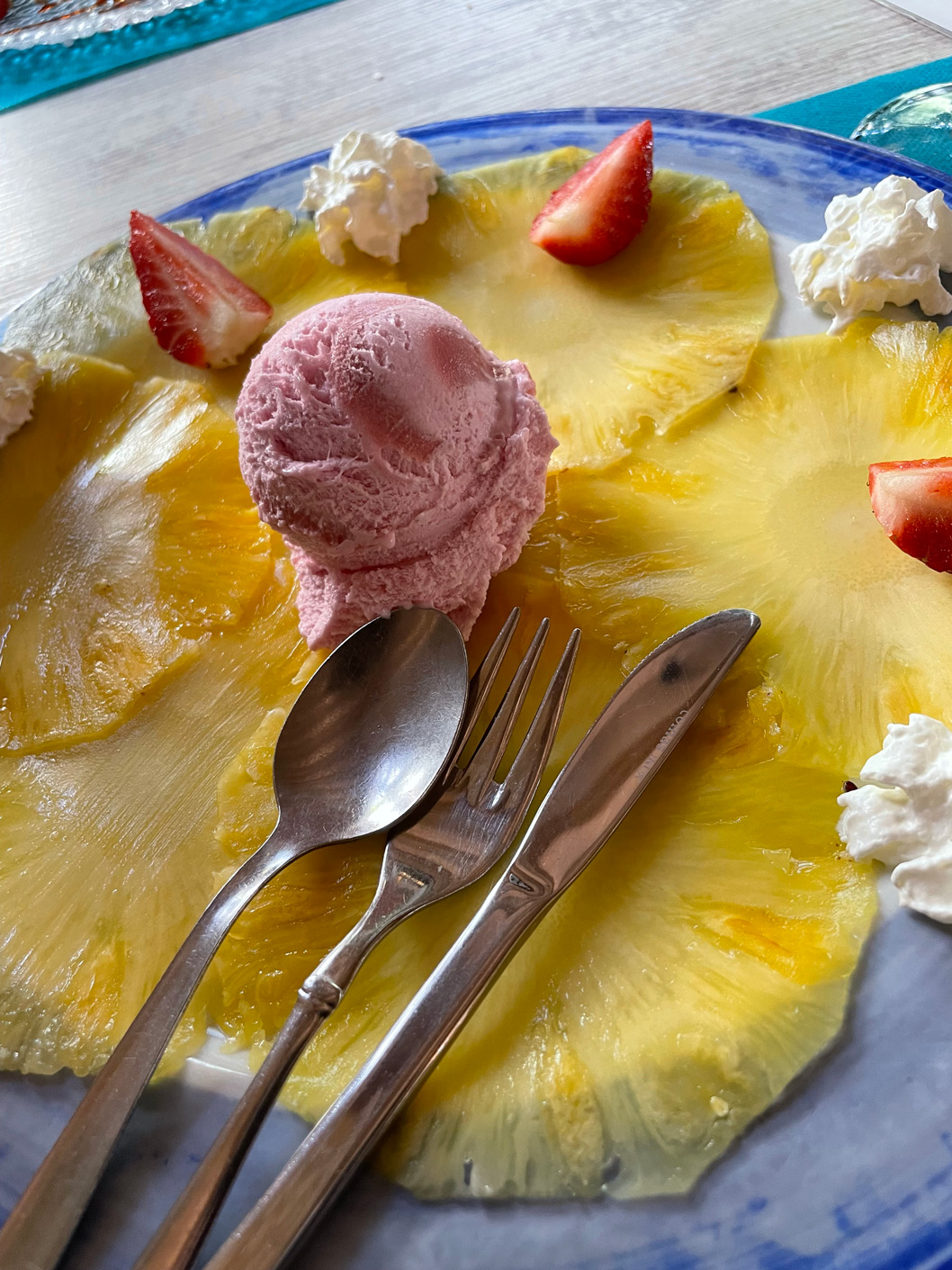 We ended lunch with the house speciality, ‘Binicanella’ – a caramelised semifreddo with almonds (7€) and pineapple carpaccio with ice cream and red fruits (6€). Popular Mallorcan desserts almond cake with vanilla ice cream and crema Catalana are traditional desserts offered.