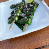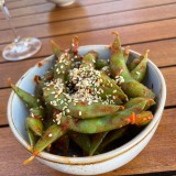 From the snacks and salads section of the menu, we began with spicy edamame beans (I think I’m addicted to these) (8,50€) and grilled Padrón peppers with yuzu salt (10€). Both were delicious. The edamame portion was large and delightfully messy to eat. I asked for some paper serviettes as the spicy sauce would have made a mess of the crisp linen napkins provided.