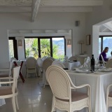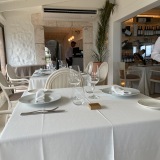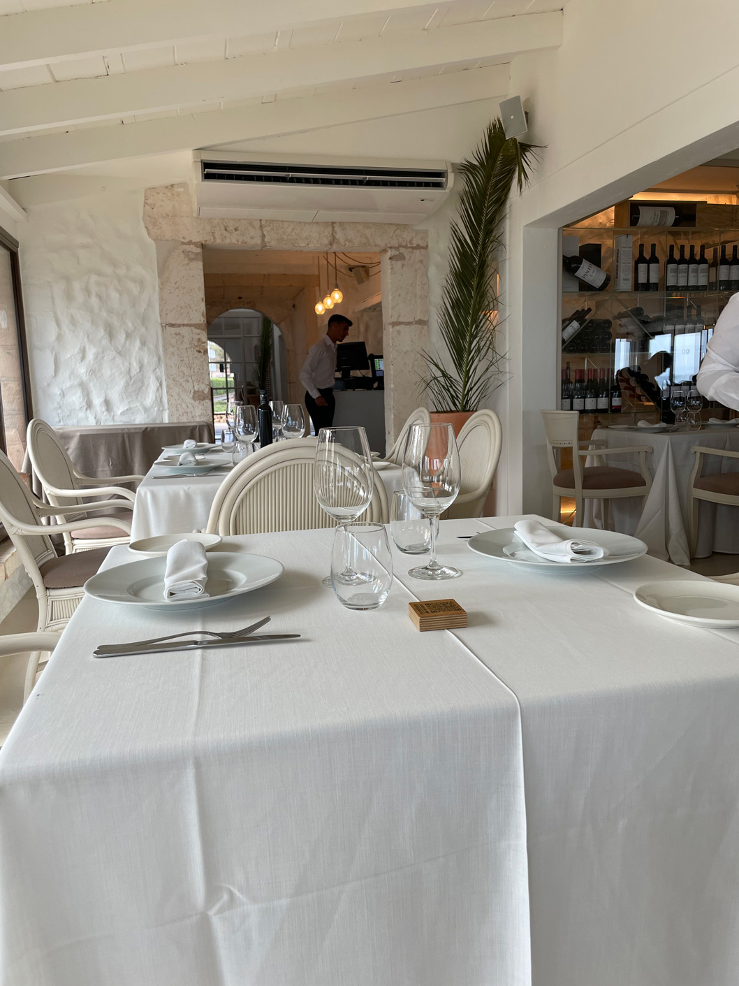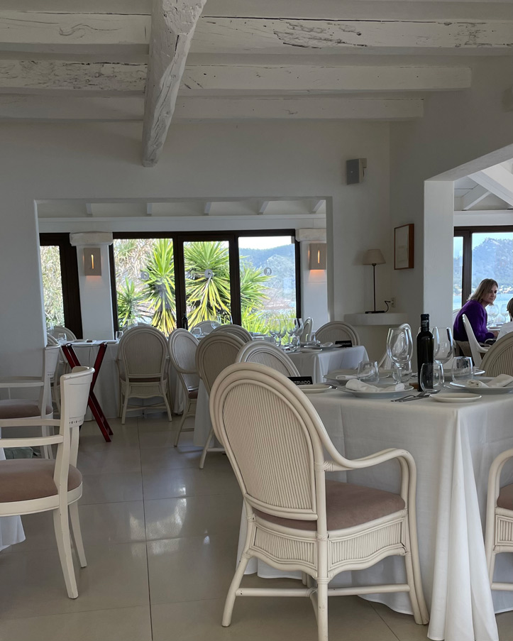 In fine weather, tables are set on the large terrace, protected from brisk sea breezes by glass screens preserving the glorious views from Sa Punta’s coastal promontory. The temperature wasn’t warm enough that Sunday for the terrace, so only the dining room was in use. This elegant space is decorated in soft whites and shades of cream, with white tablecloths and napkins, and picture windows for the sea views.