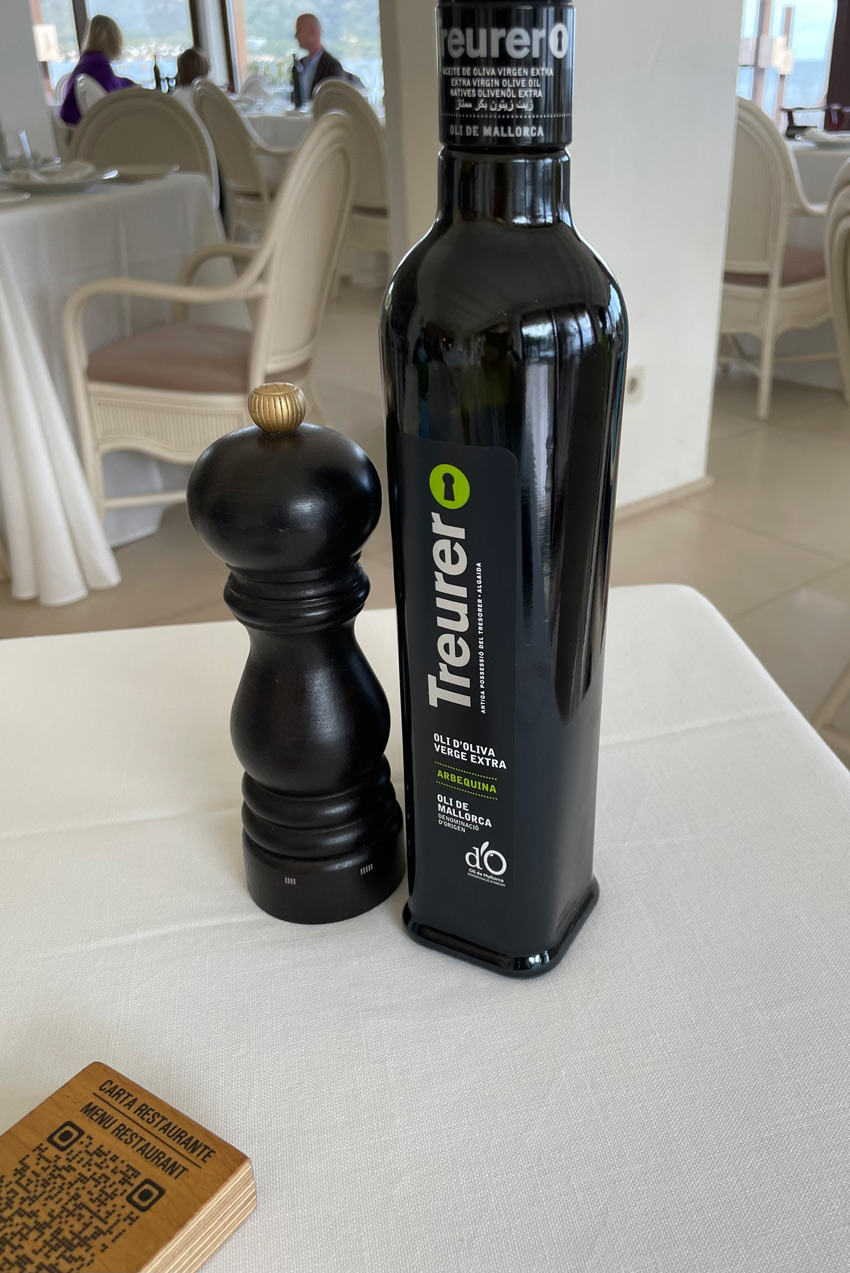 We began with a glass of cava ‘rosado’ (7,50 €) while studying the menu. Bread, olives, and aioli arrived. The last time I reviewed Sa Punta, I noted that the extra virgin olive oil was from the Peninsula. I’m pleased they now have the Mallorcan brand Treuer, from near Algaida. Although Sa Punta’s menu is the same as last year, it will change sometime after Easter. Ecuadorian chef Juan Pablo Martinez joined Sa Punta in June 2023, having previously worked in Ecuador, France, Cuba, Andorra, and Colombia.