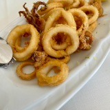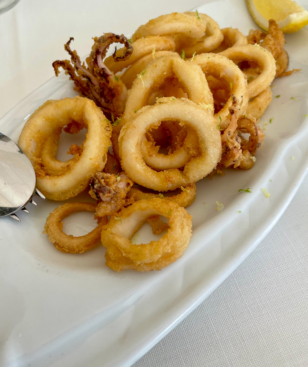 The coastal location means plenty of fish and seafood on the menu – including the day’s catch from their boat. We shared Andalusian-style hooked squid (20 €) from the nine starters, which also included good Iberian ham croquettes and grilled vegetables with romesco sauce.
