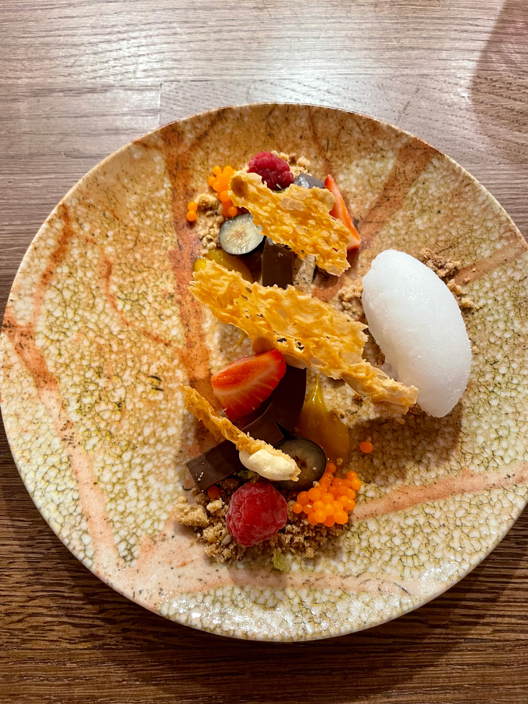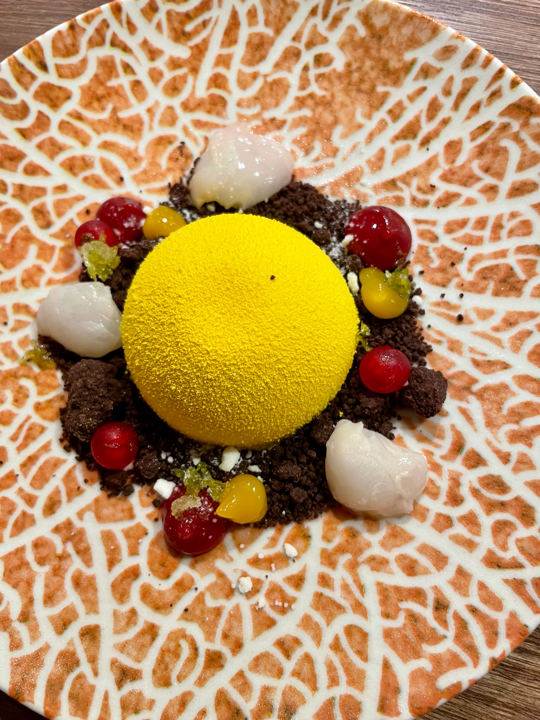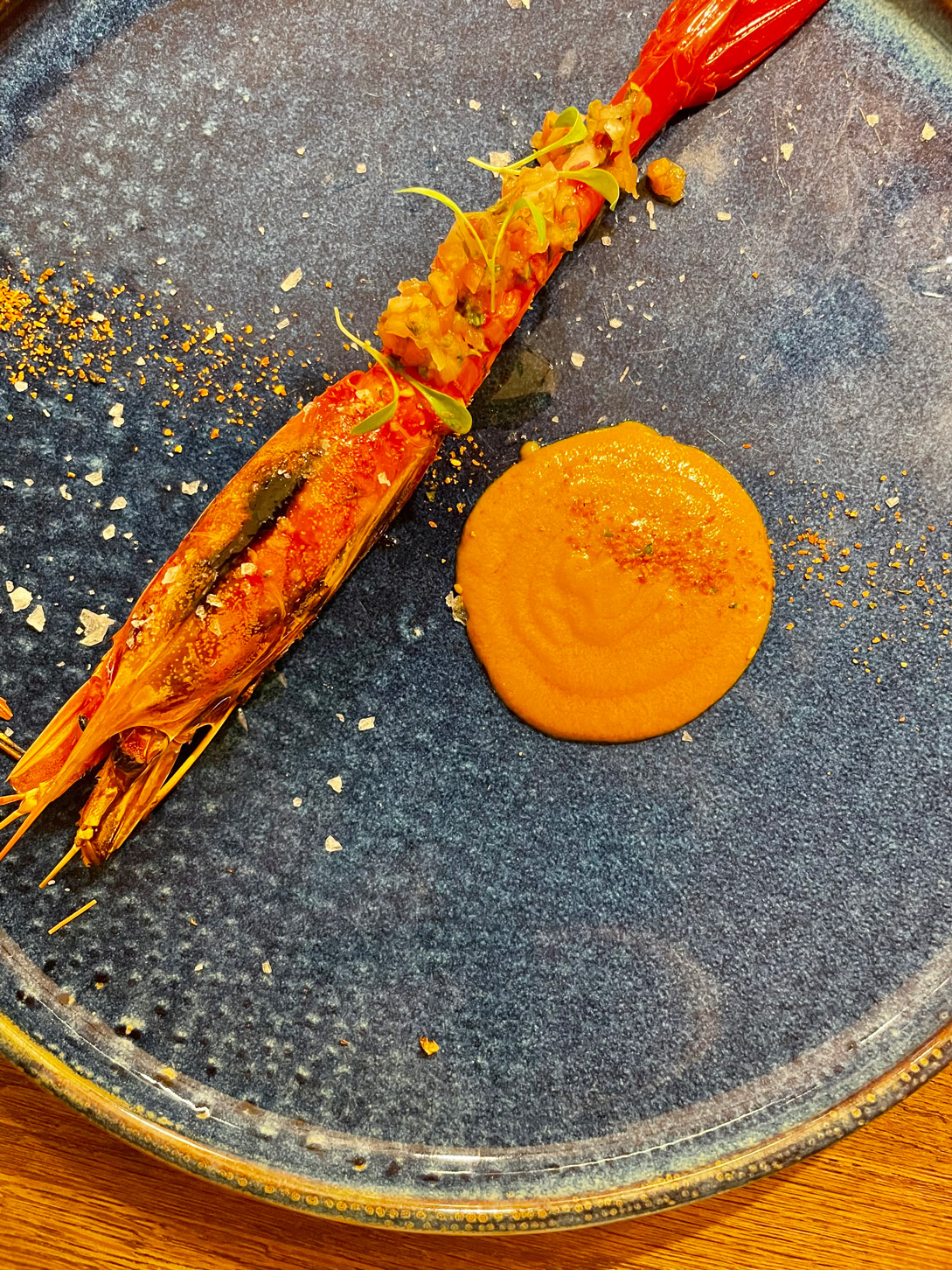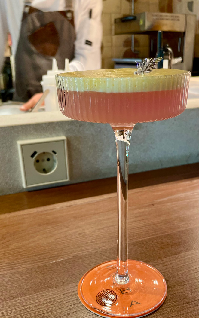 Aloft on two of the 14 surprisingly comfortable armchair stools, we began with a drink. I had the cocktail of the day: Mallorcan Flower, a delicious combination of the island’s Cabraboc gin, tea flowers, and citric, topped with a passion fruit mousse. Delicious!
