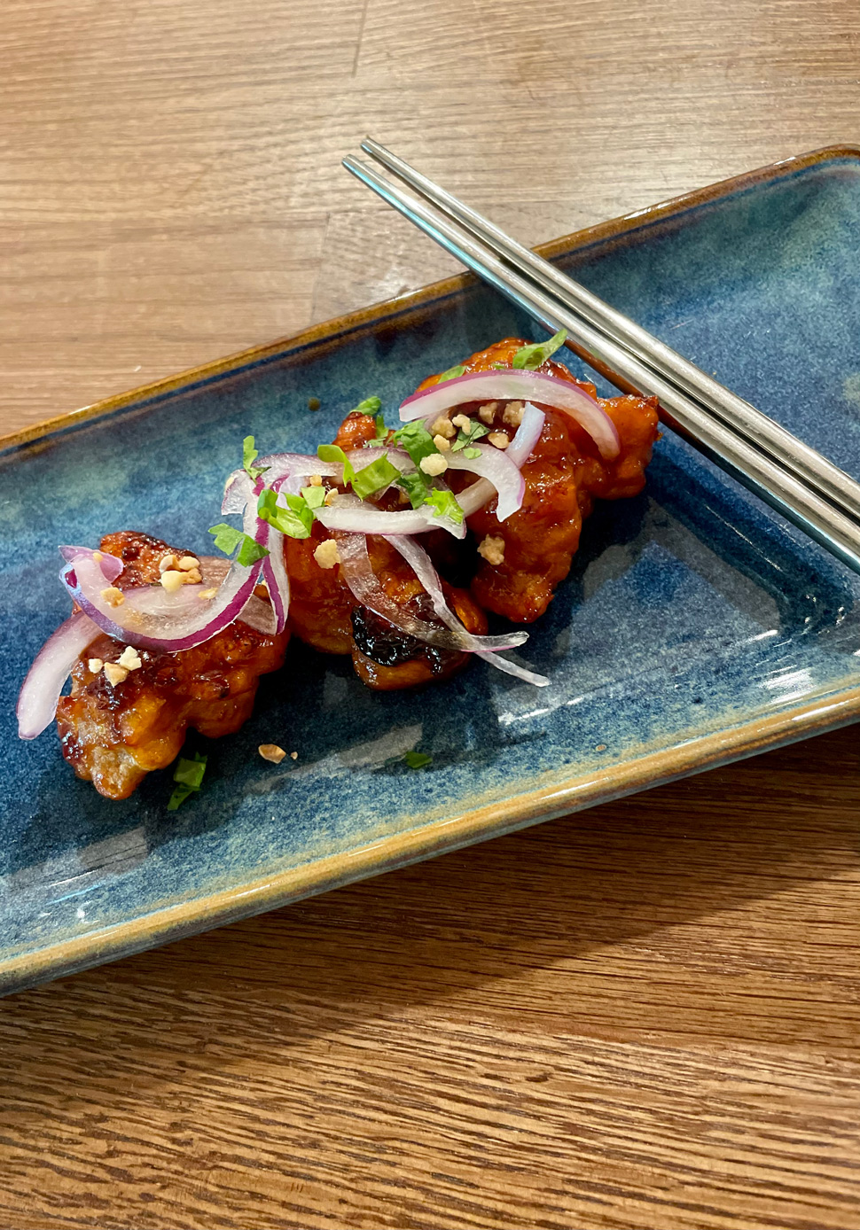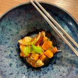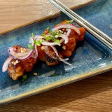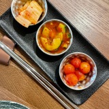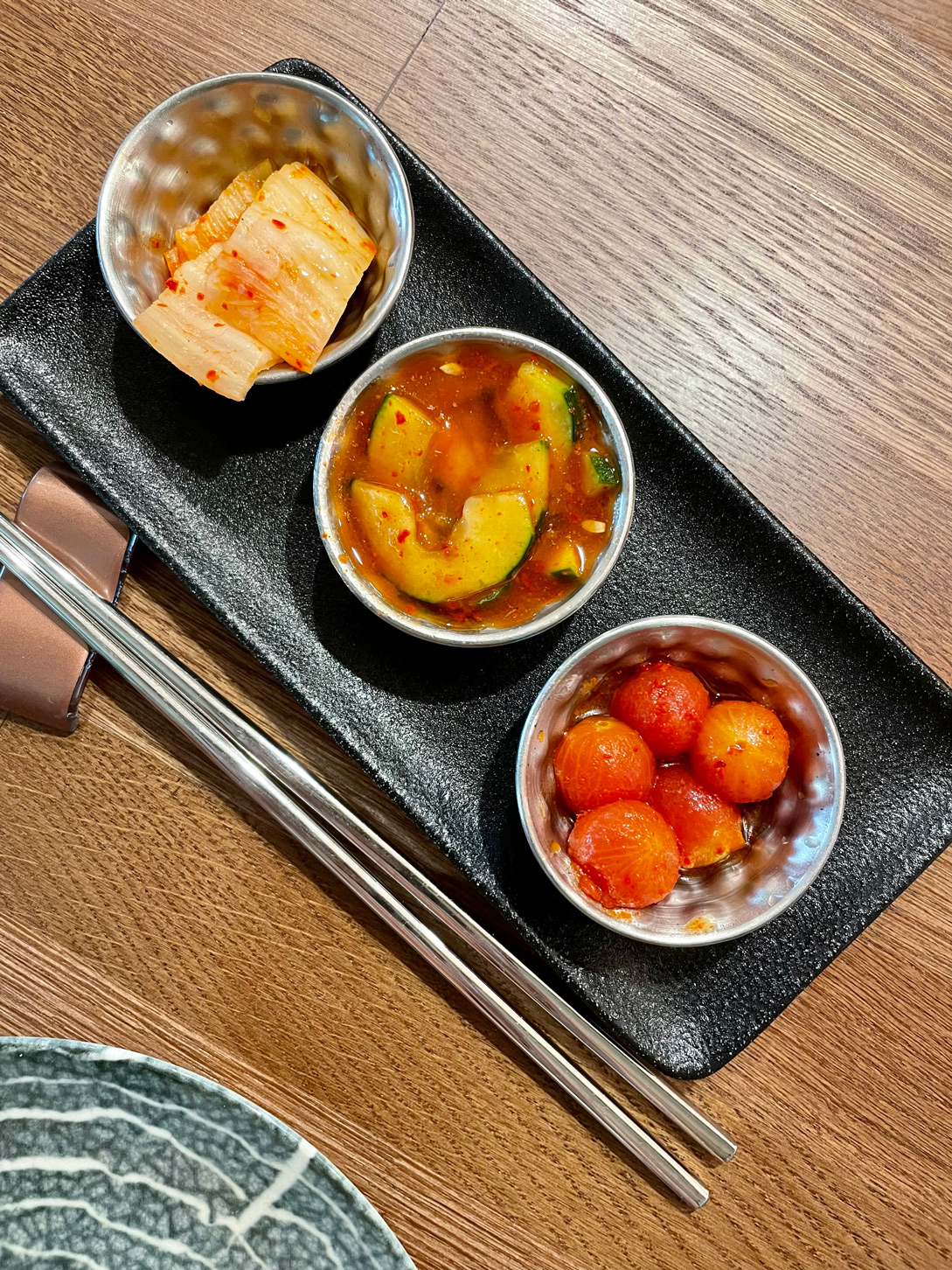 Our charming waiter, Ben, first brought us each kimchi and banchan – three small portions of different fermented vegetables. As a huge kimchi fan, I soon emptied my small bowls; the first steps on an exciting Asian gastronomic journey.