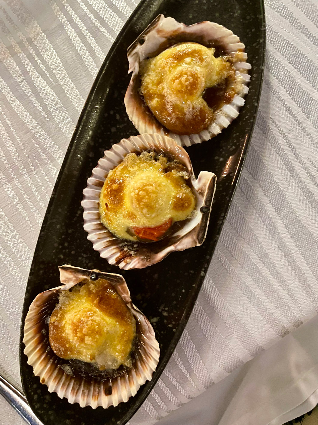 I started with a balsamic vinaigrette-dressed mixed salad; my husband enjoyed his stacked tomato and mozzarella salad. My gazpacho of cucumber, apple, and ham strips was refreshing on a hot evening, while my husband loved his creamy velvet swimming crab soup; I had a spoonful of it and it was very good. We both chose gratinated queen scallops for our ‘starter’ and could happily have eaten a second portion of this excellent dish.