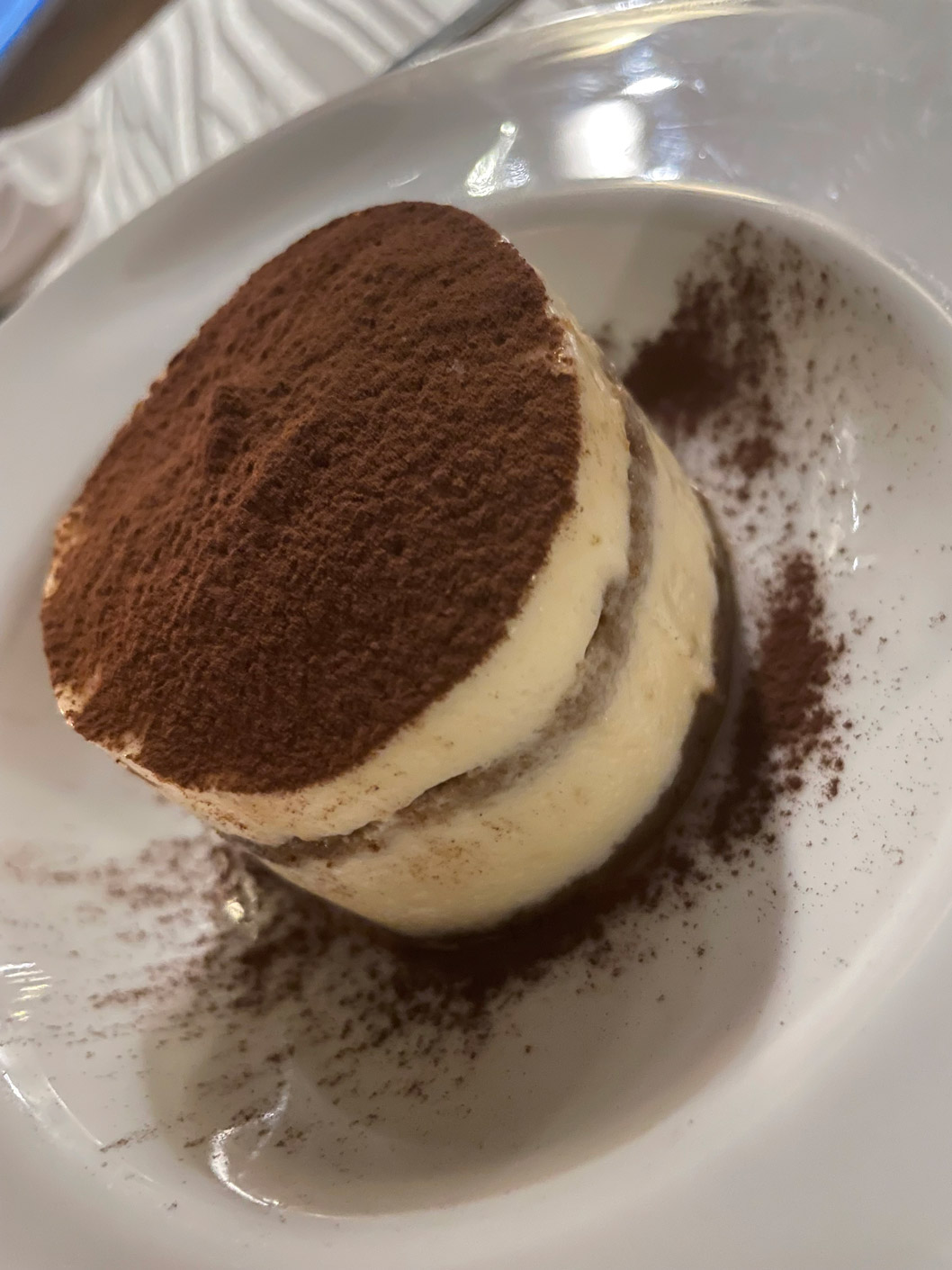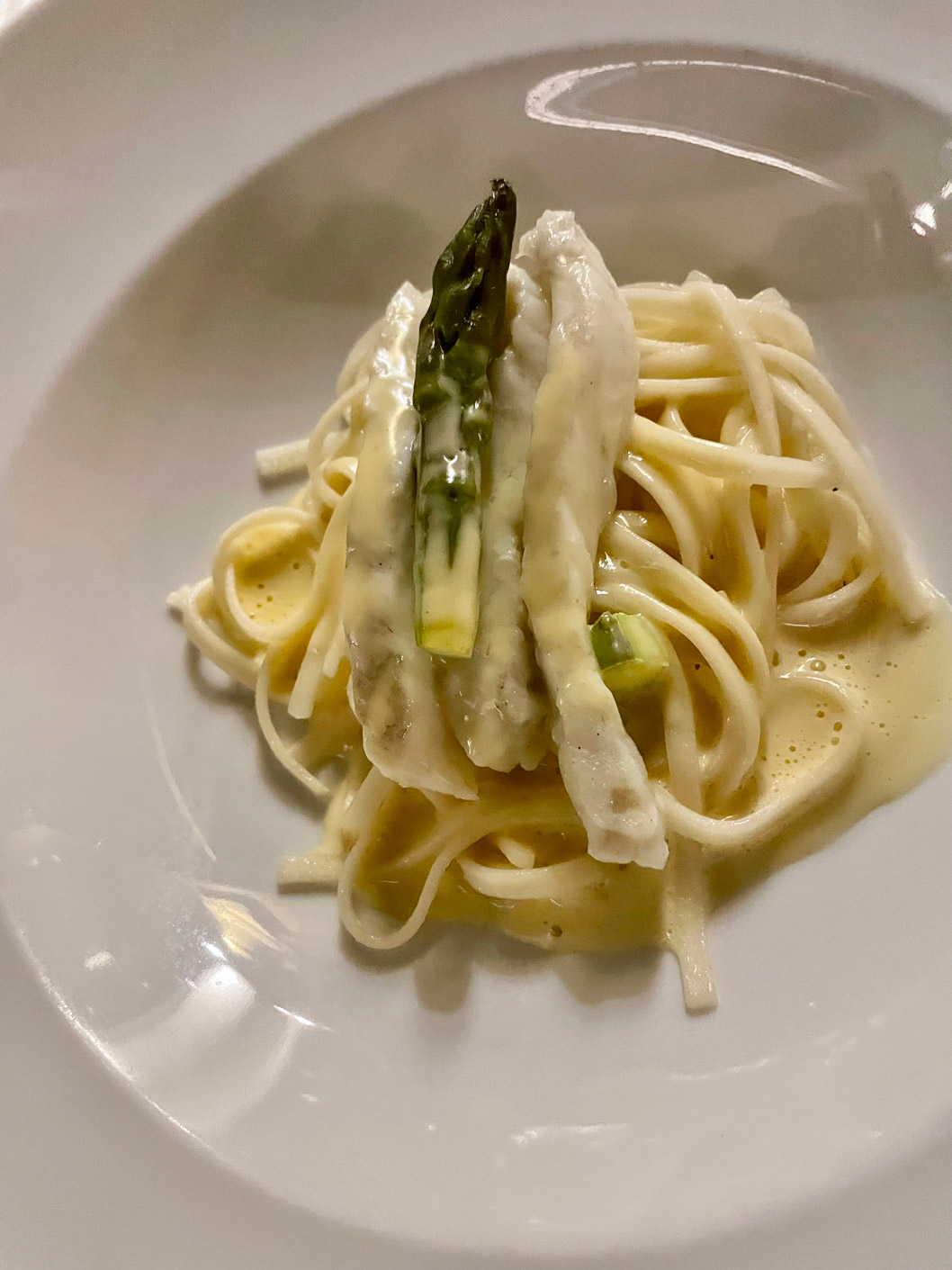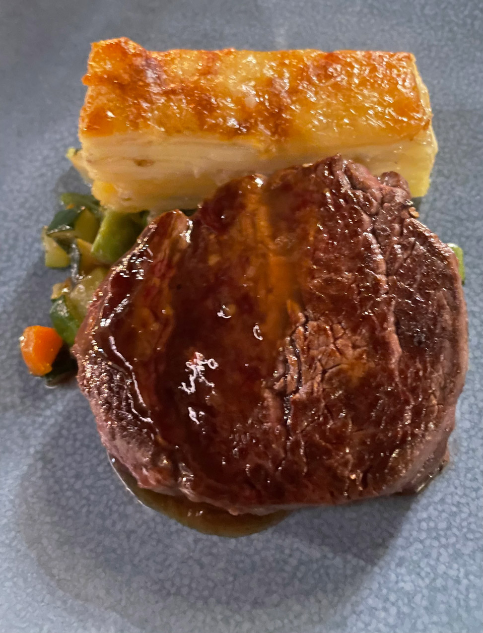 My husband stayed with seafood for his main course: braised strips of turbot with noodles and green asparagus. I had a tasty and tender beef fillet with potatoes au gratin and vegetables – a delicious dish.