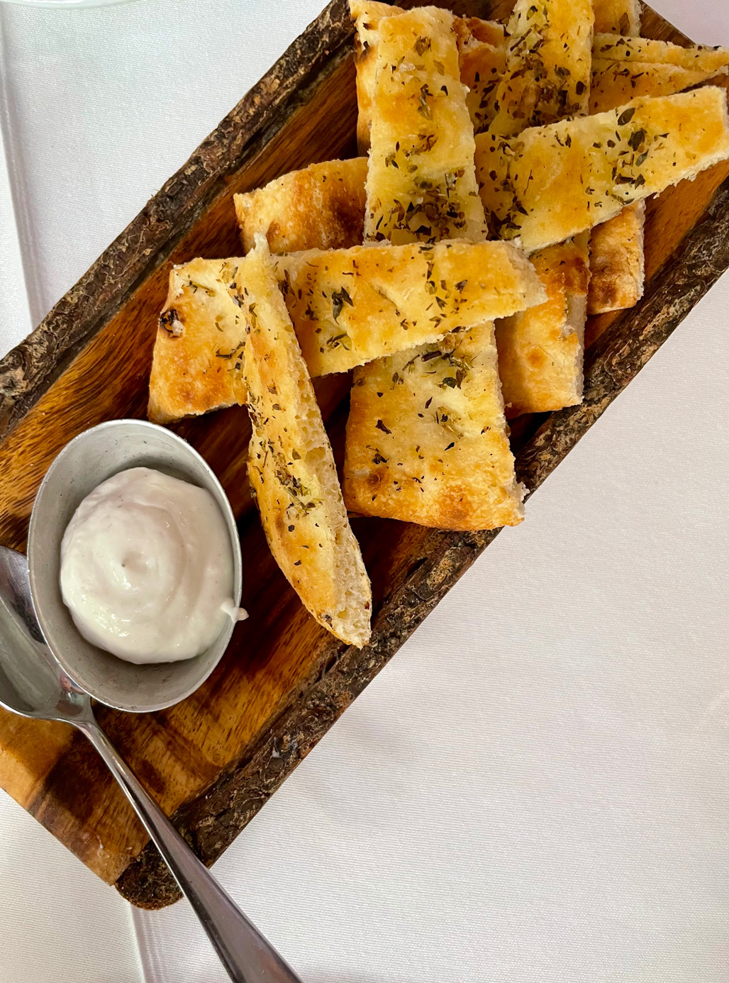 The à la carte menu features all the classics of the Italian kitchen, and we were off to a good start with warm focaccia and tasty olives in a home-made dressing (2,60 €) and a glass of prosecco (4 €).