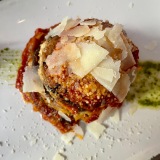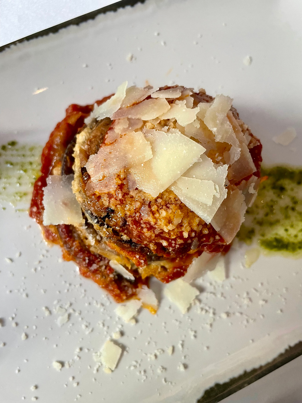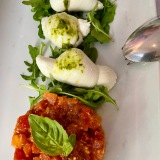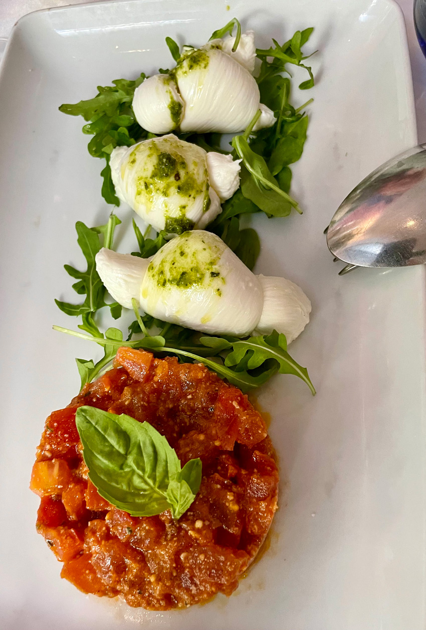 Our friendly server, who also speaks perfect English, told us of three additional dishes available that day. We chose to share one of these – mozzarella ‘knots’ on a bed of rocket and a tomato concassé (17,50 €) – and, from the menu of antipasti, the classic ‘melanzane alla parmigiana’ (my favourite aubergine dish) (13,50 €) I was intrigued by the notion of the cheese dish, imagining an Italian ‘nonna’ somewhere in her kitchen, somehow tying mozzarella into knots.