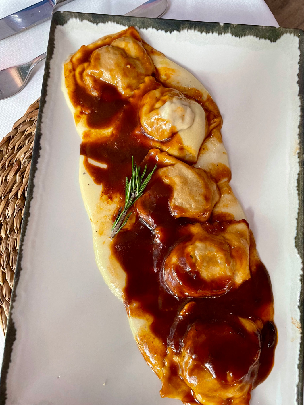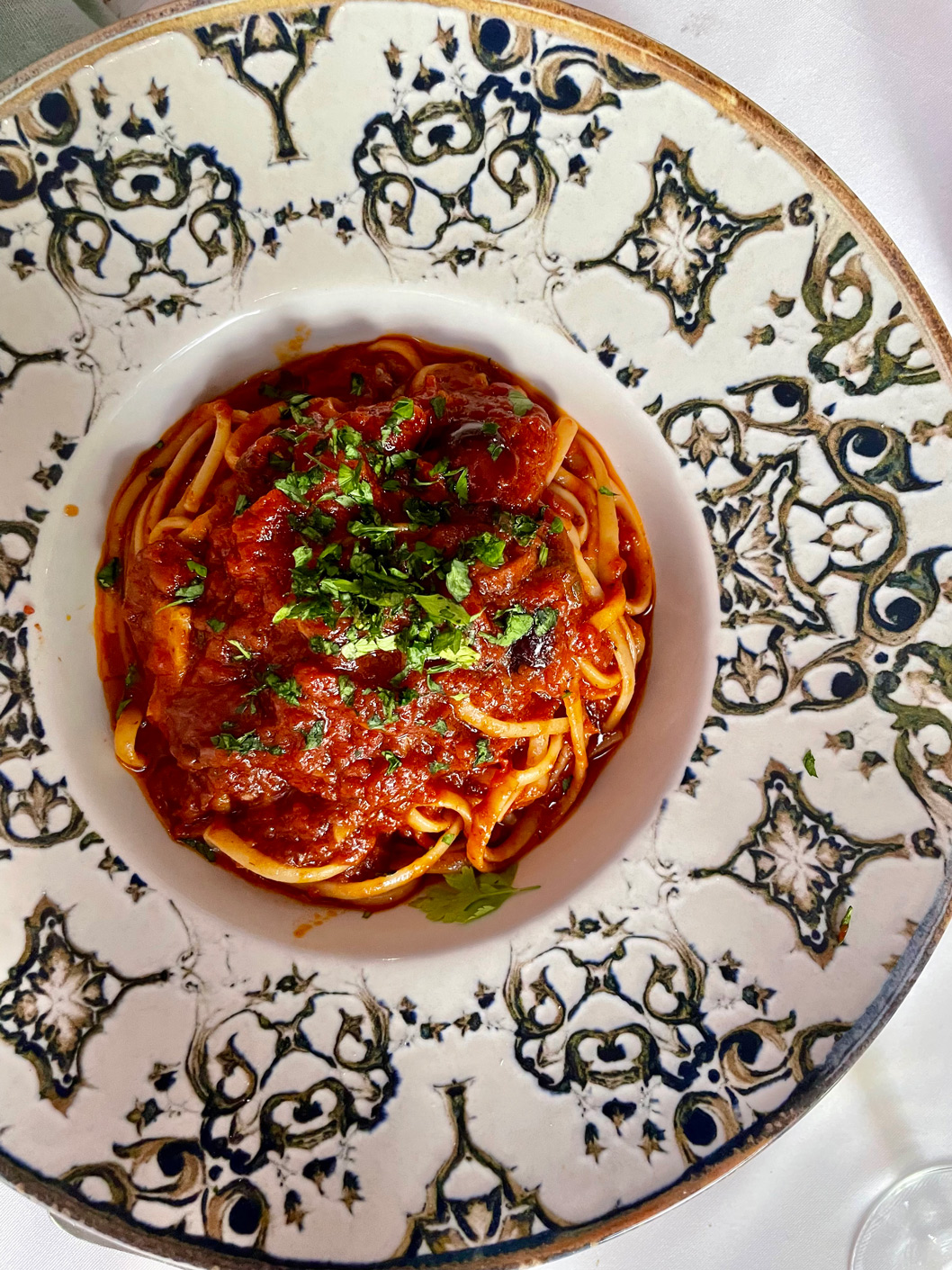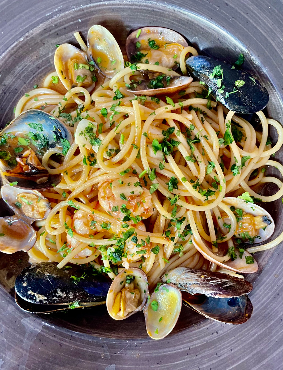 Two of us had different ravioli dishes, one had linguine alla Puttanesca (14,50 €), and I had a generous portion of spaghetti ai frutti di mare (19,50 €). None of us chose the dish that Morgan Freeman made famous when he ate here while filming in Mallorca in January this year. The movie star declared the home-made tagliatelle alla Bolognese ‘the best of my life’ and returned to Sandro to eat it again within days. The dish is now highlighted on the menu with a small illustration of the movie star’s face. Despite its starry status, this dish costs just 17,50 €.