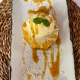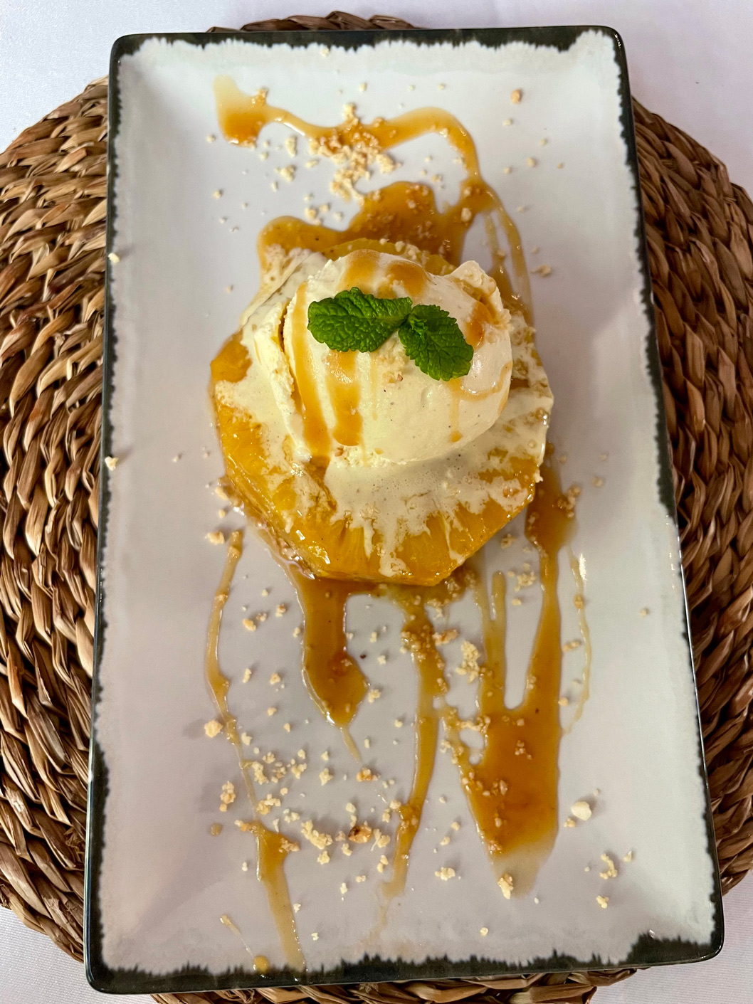 Only one of us had dessert: a thick slice of pineapple marinated in Amaretto and citrus, caramelized, and served with vanilla ice cream (6 €).